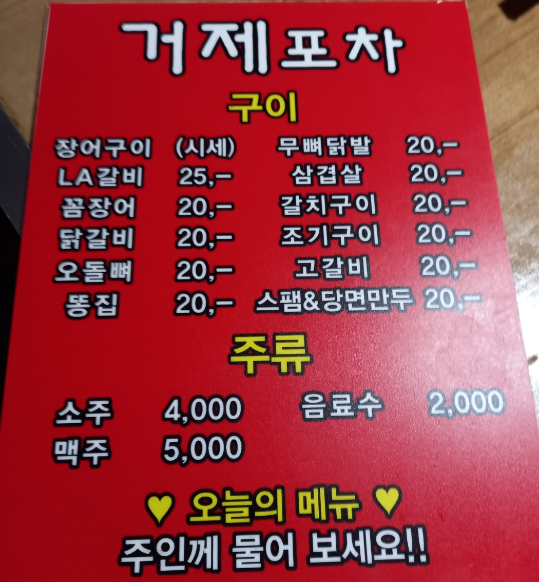 메뉴판을 보았는데 거제포차라 적혀있었고 예전에 본적이있어서 위쪽을보니 거제집입니다.