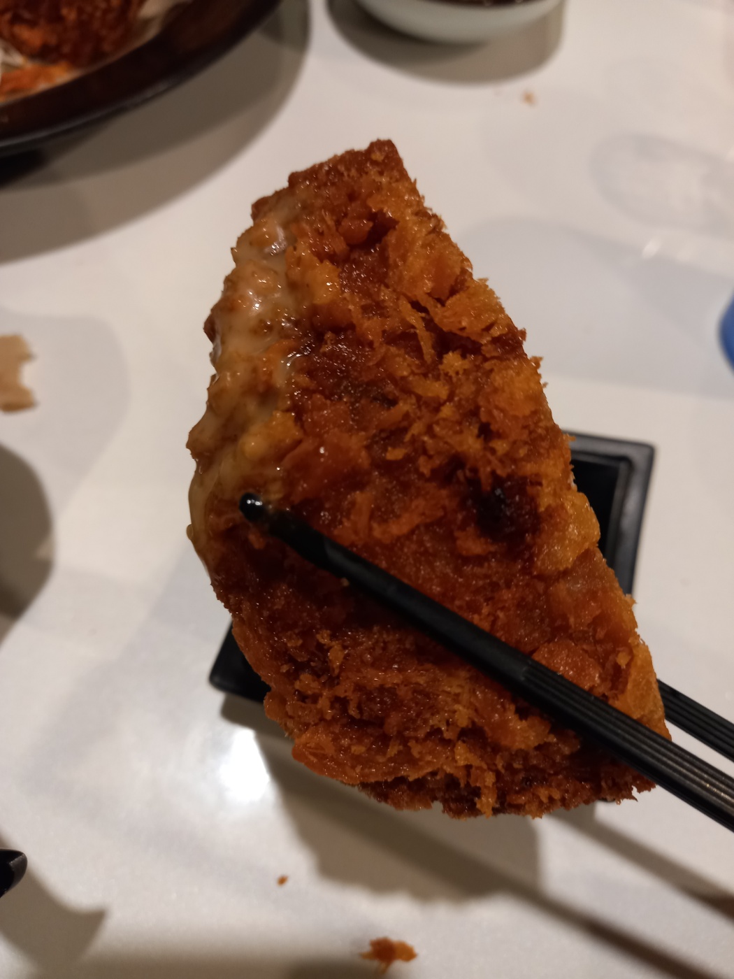 두툼한 멘츠카츠를 집어서 앞접시로 들고왔습니다.