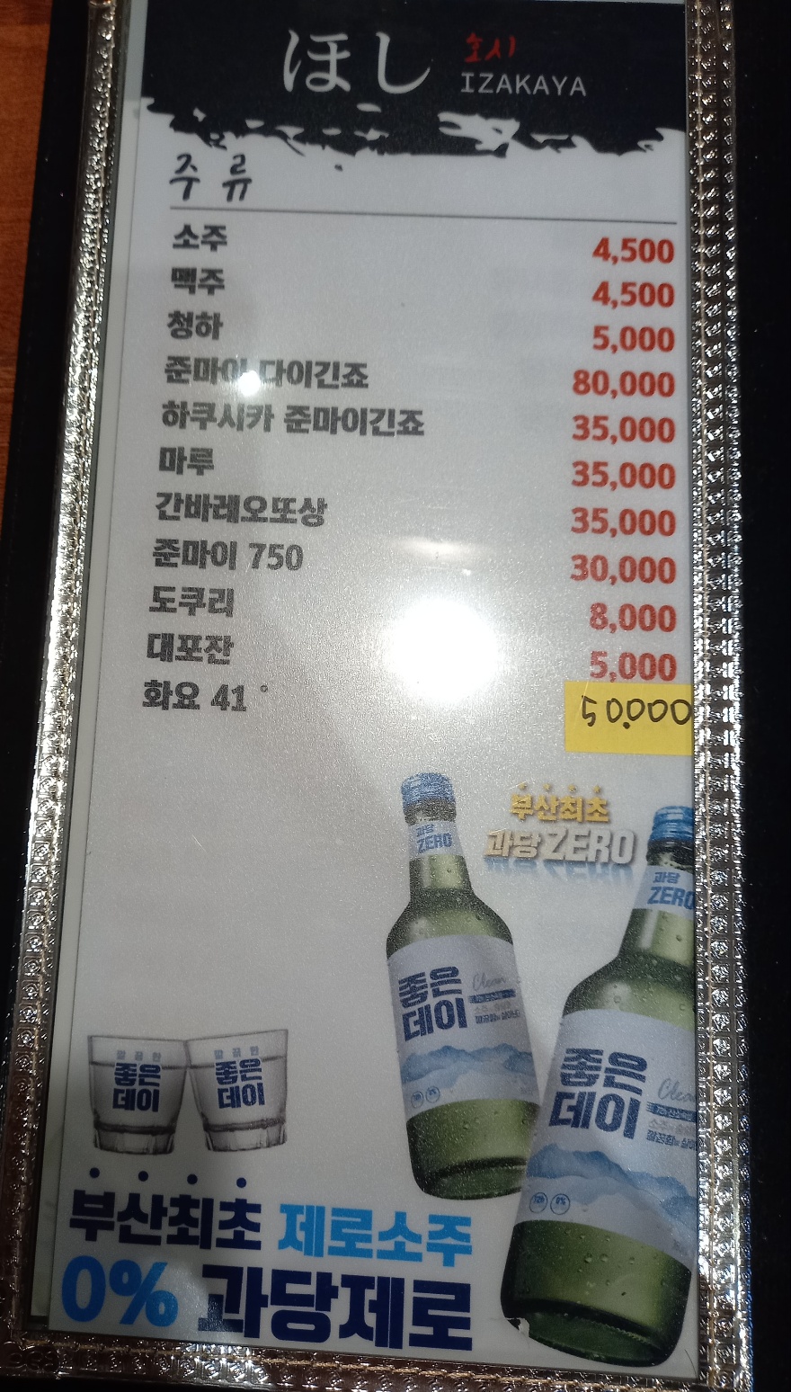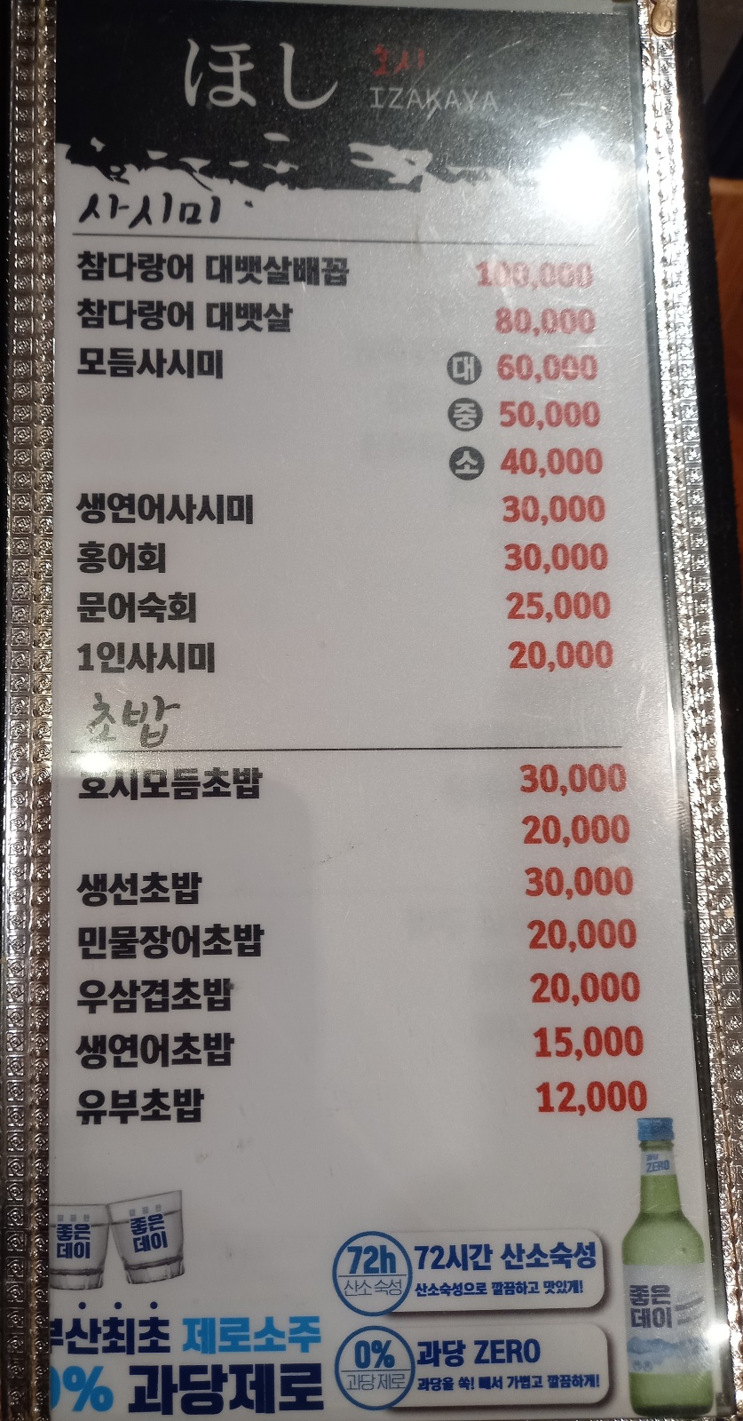남항동 호시 메뉴판입니다.
