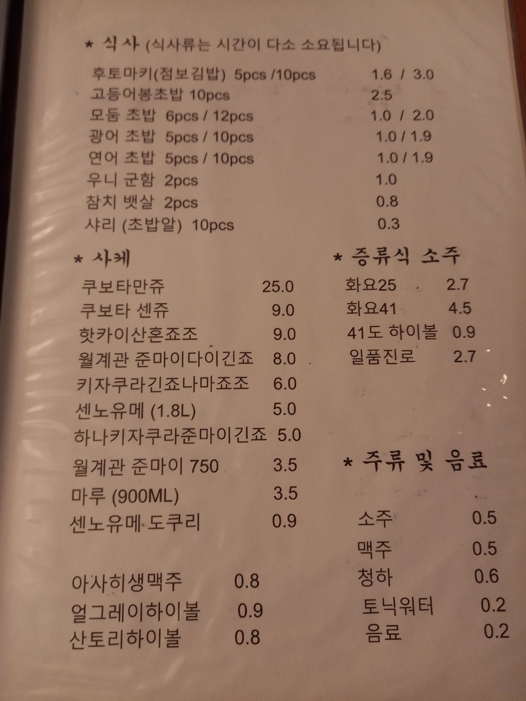 사시미 일품요리 탕 튀김 기타메뉴들을 판매하고 있었습니다.
