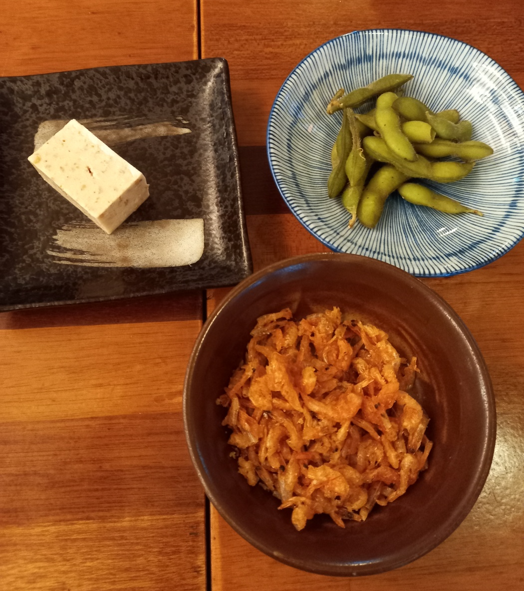 주문을 하고 밑반찬으로 완두콩, 마른새우, 참깨맛이나는 두부같은면서