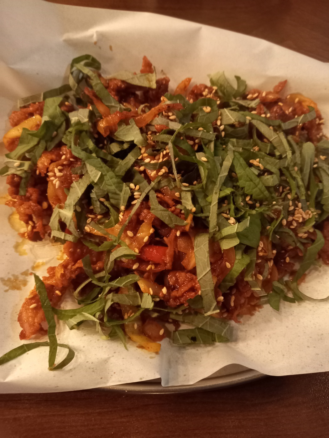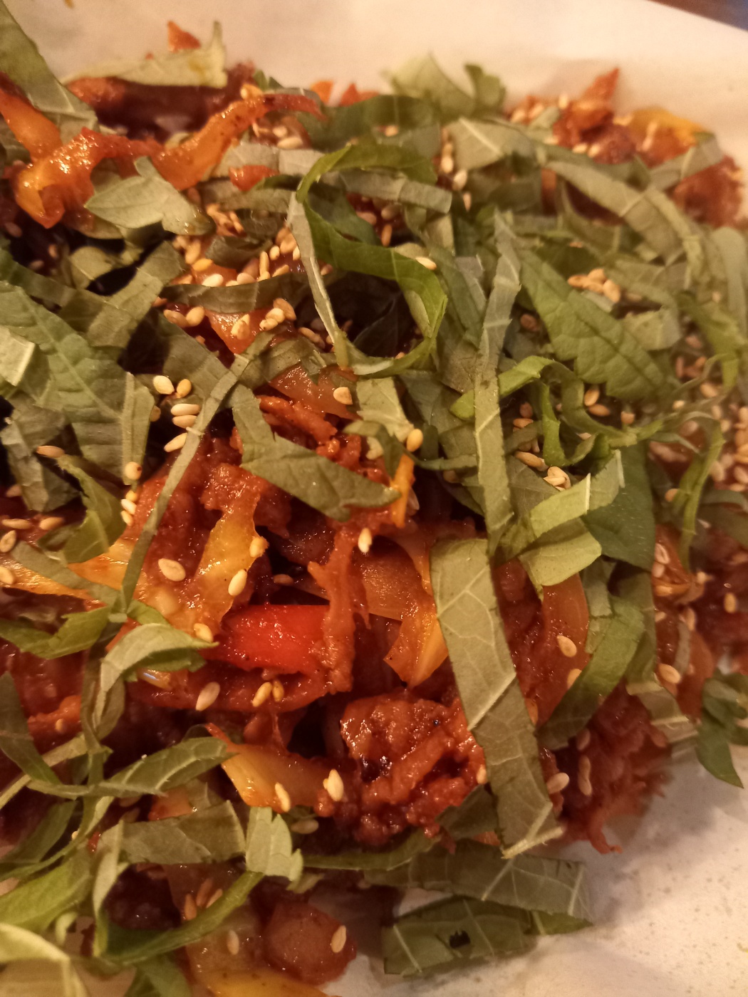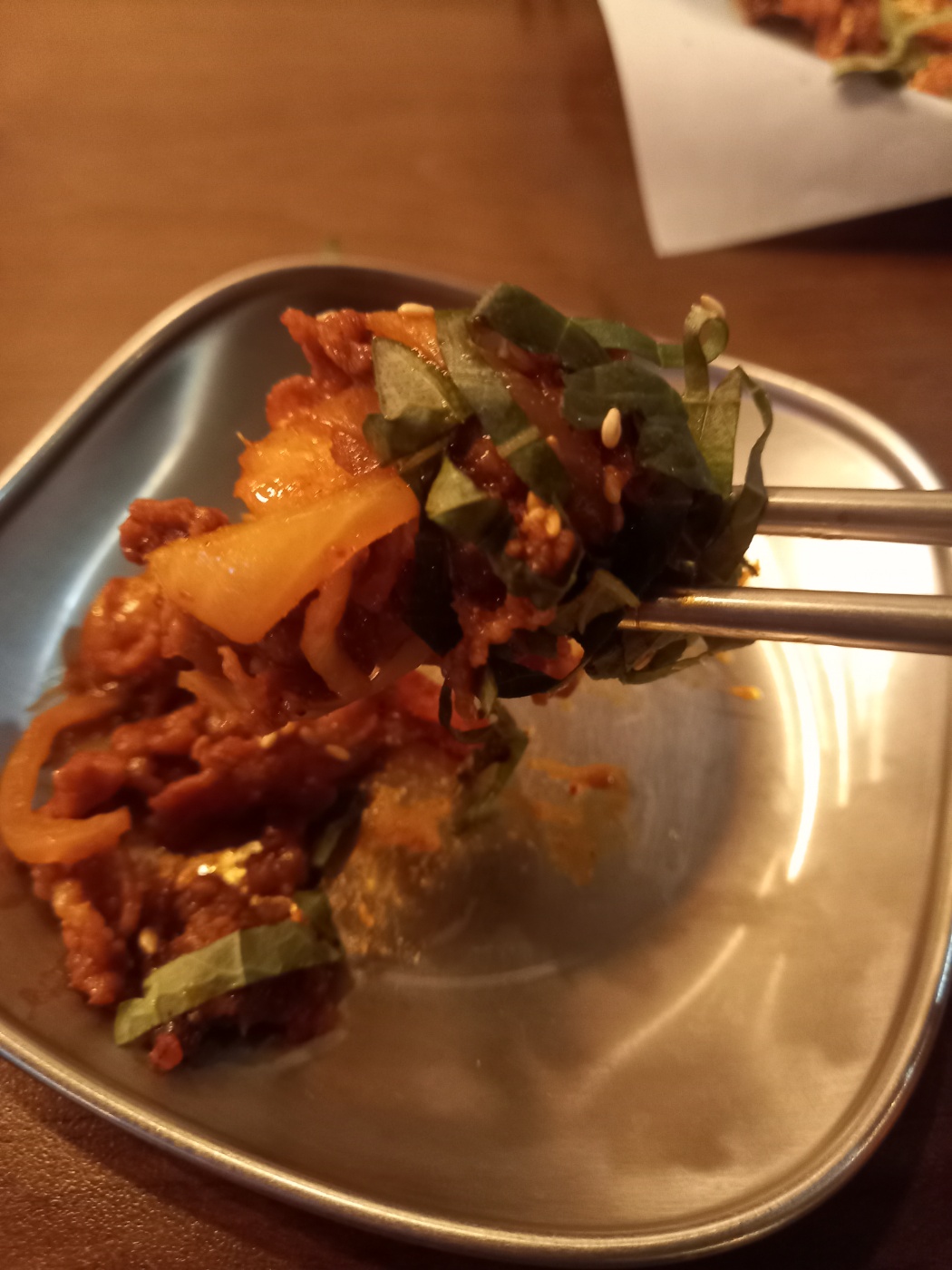 먹어보니 매콤이라고 하긴했는데 맵지는 않고 불맛이 살짝나면서 위에 올려져나오는 깻잎향과 어울려