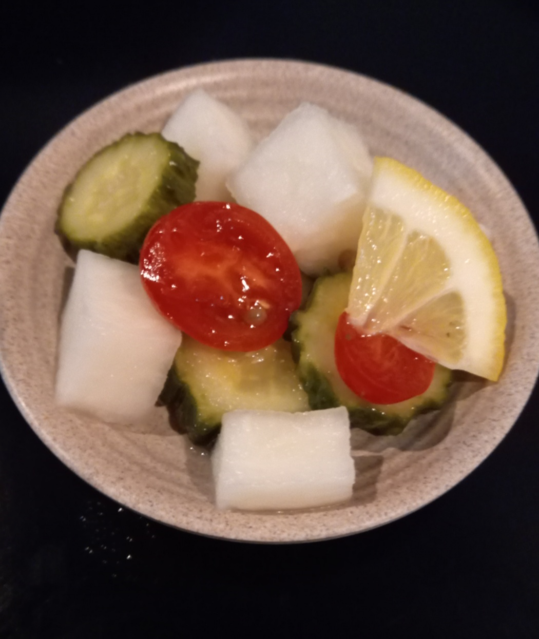 그리고 파스타와 함께 먹을 상콤한 오이 무 토마토 레몬이 나옵니다.