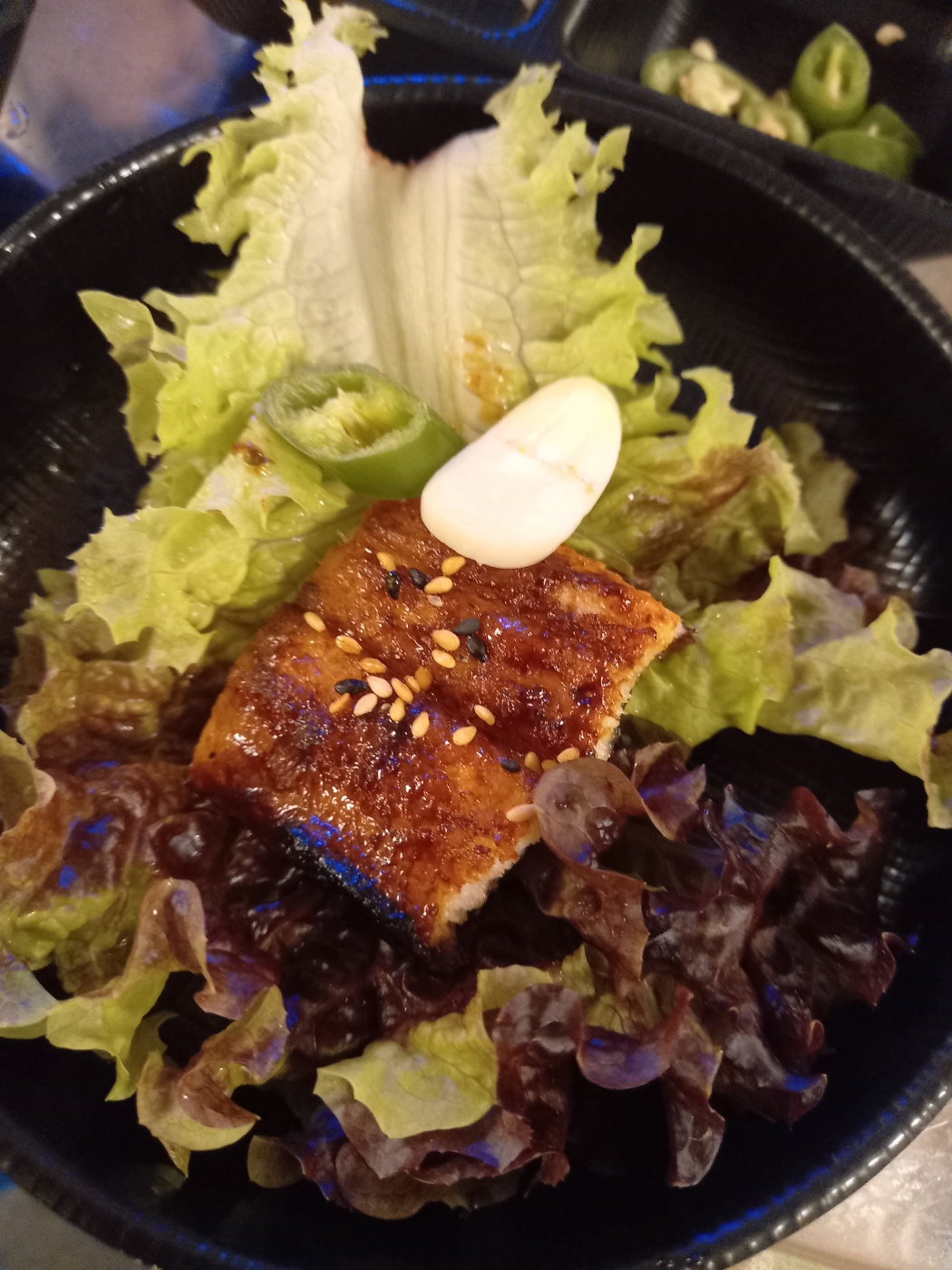 그리고 상추에 장어구이와 마늘 고추를 함께 올려서 먹습니다.