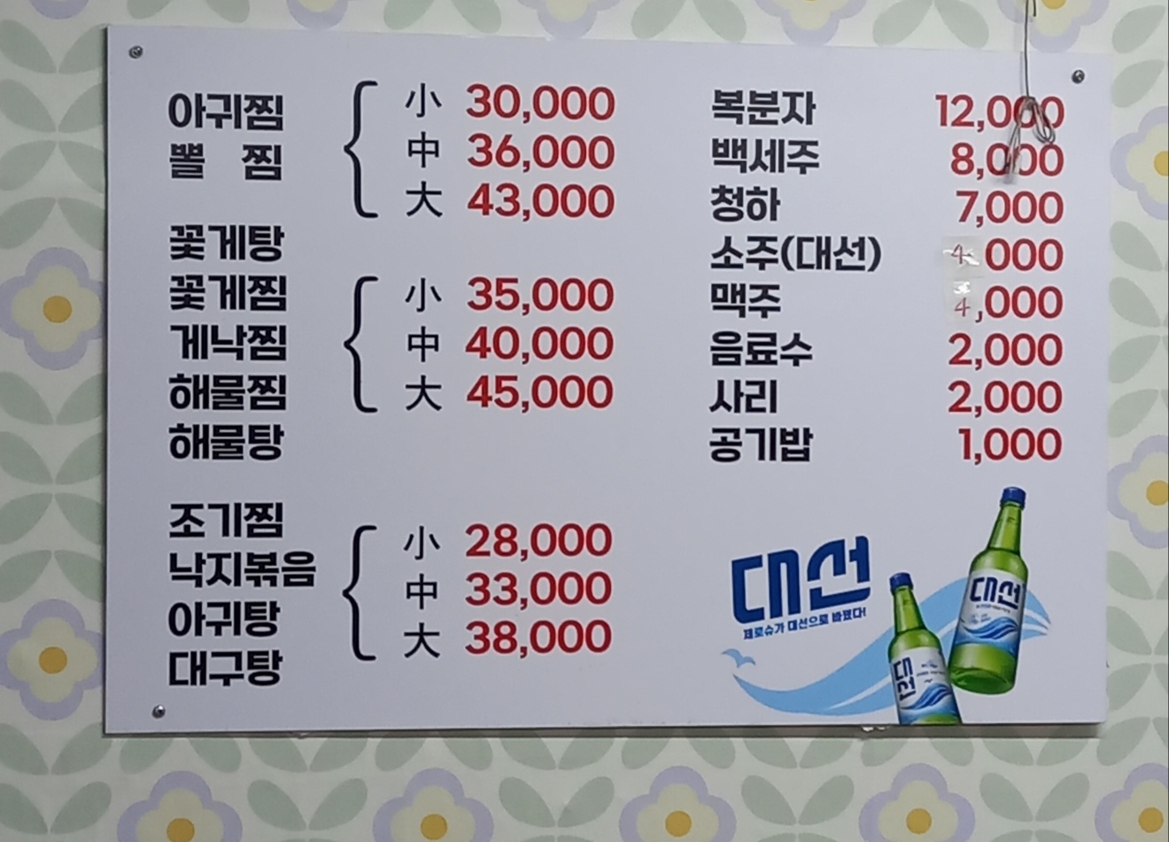 남포동 송도집 메뉴판입니다.