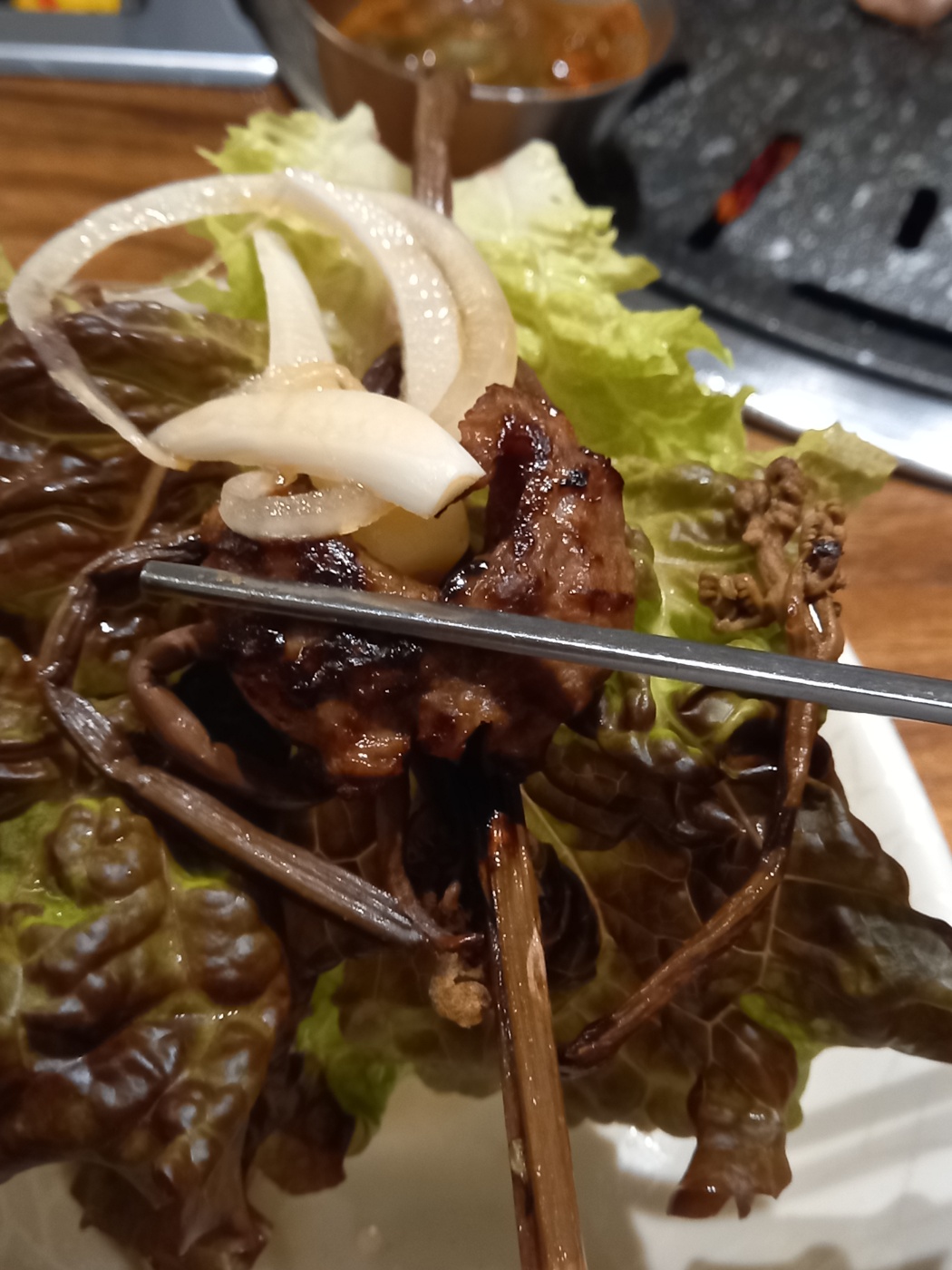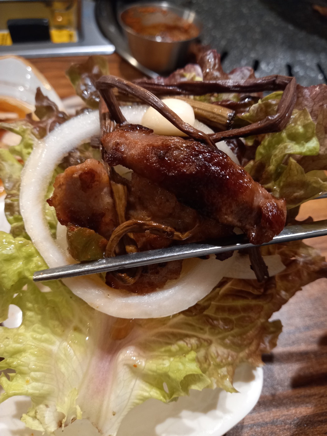 맛있는 뒷고기를 상추에 마늘과 양파를 올려서 먹습니다.