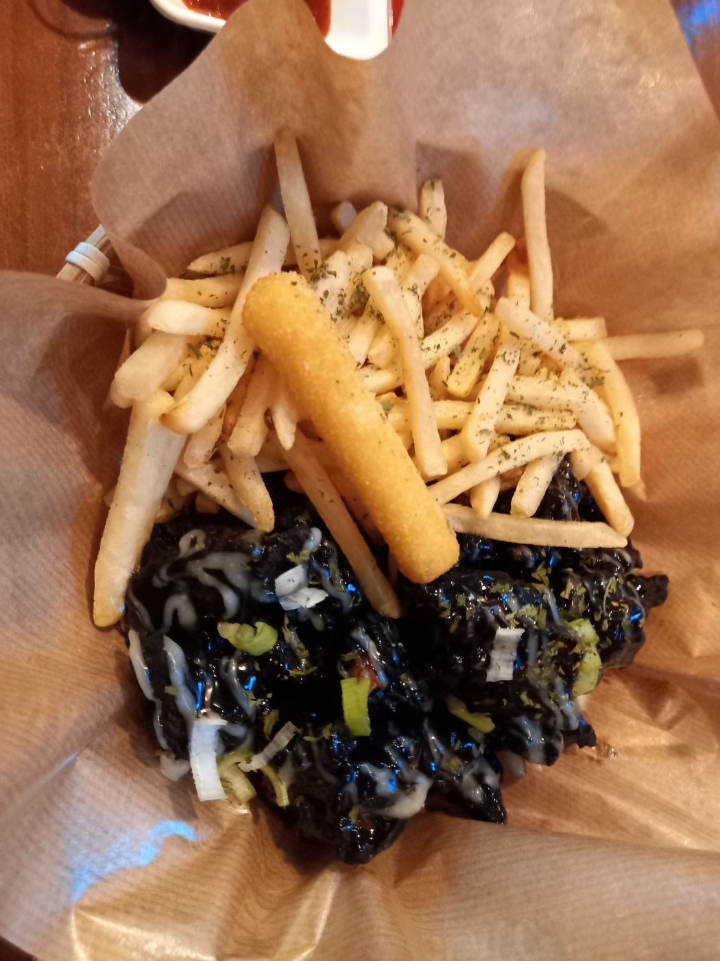 달짝매콤한 핫간장치킨과, 담백한 감자튀김을 함께 먹으니