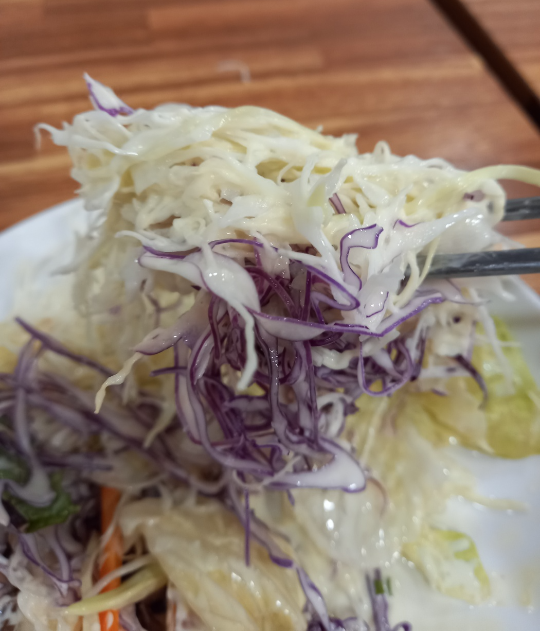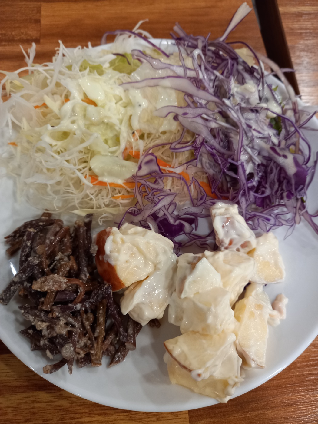 마지막으로 사과샐러드와 양배추샐러드를 먹었는데 샐러드를 좋아하다보니 생각보다 너무 많이 담아와서