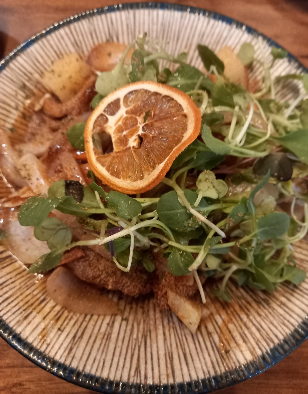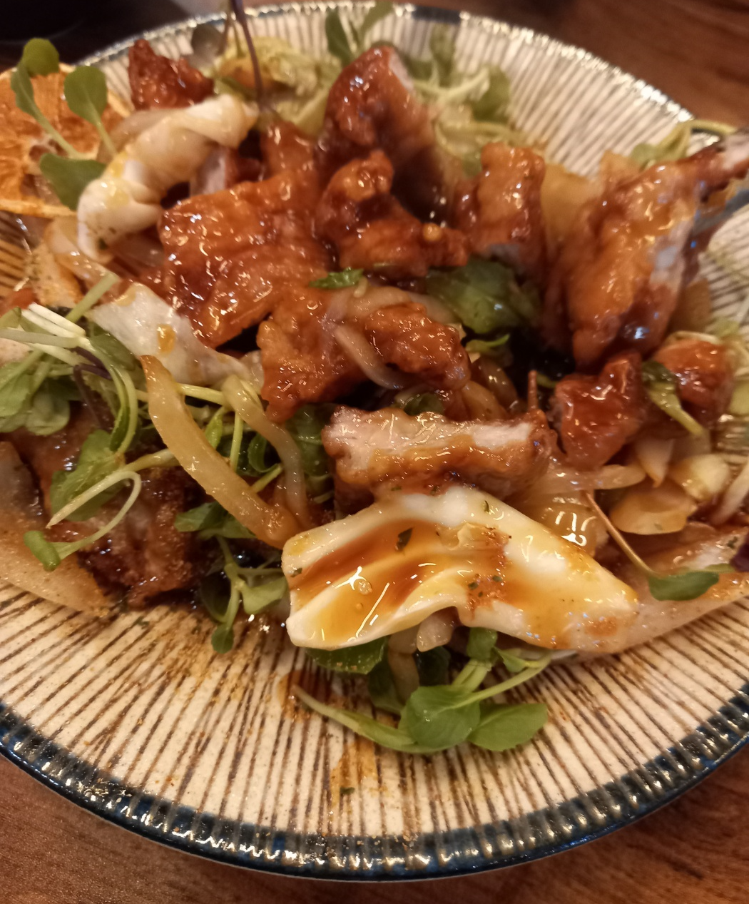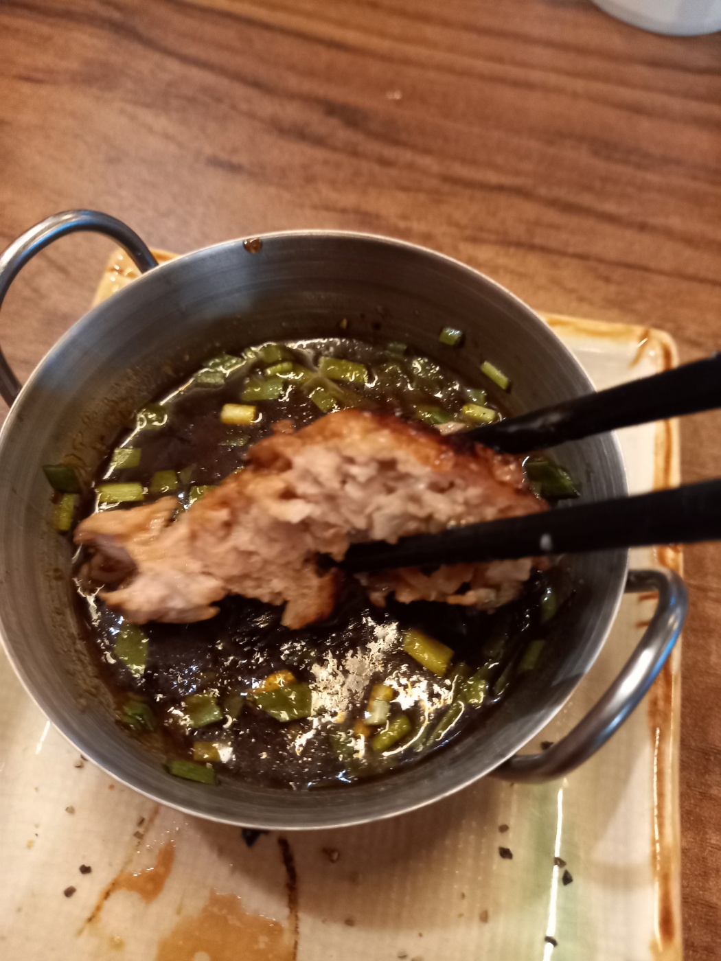 그리고 함께나오는 소스에 찍어서 한점 먹어보았는데 겉은 바삭한식감에 속은 부드러웠고