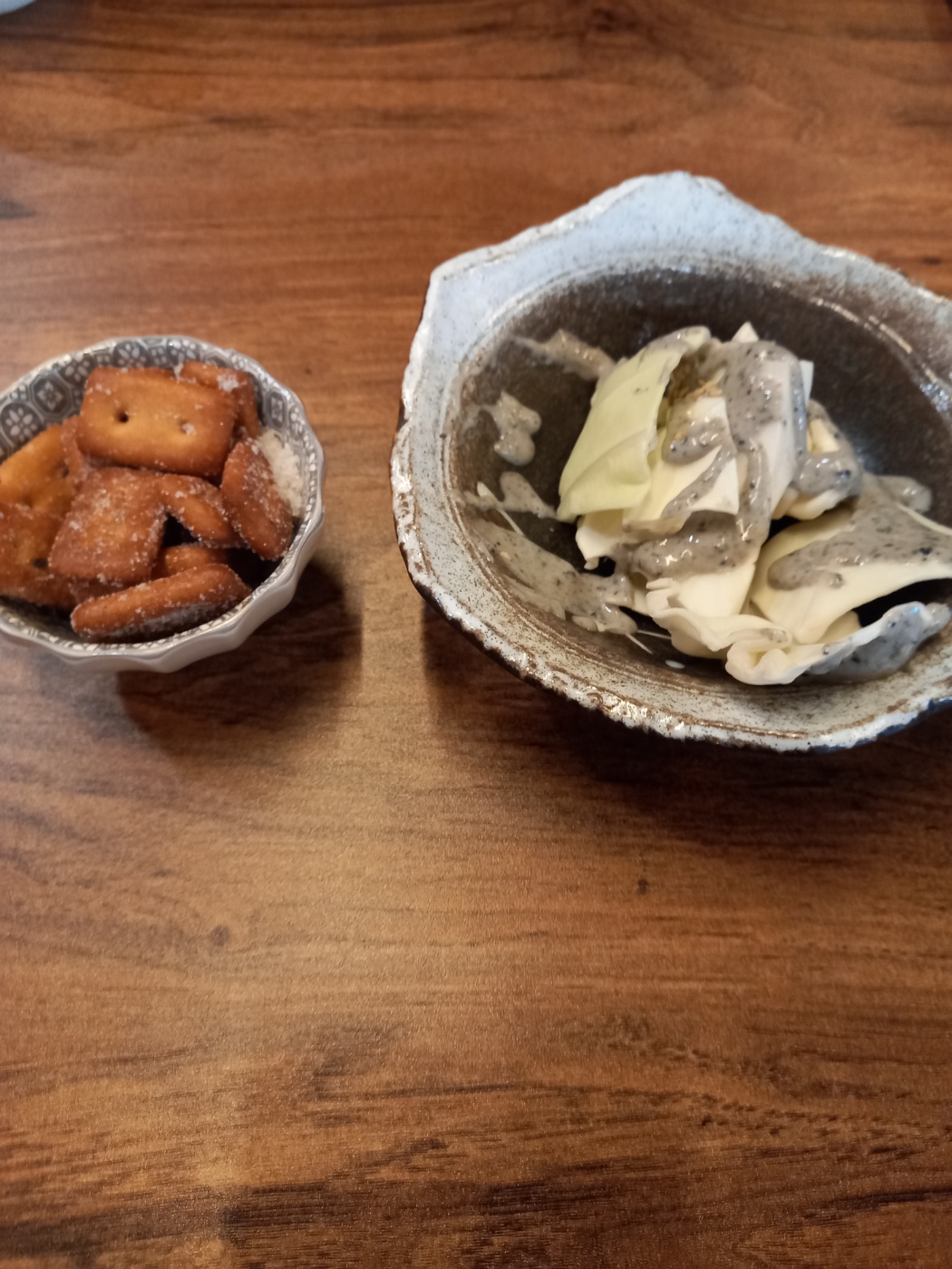 주문후 밑반찬으로는 튀긴건빵과 흑임자소스의 양배추샐러드가 나왔습니다.