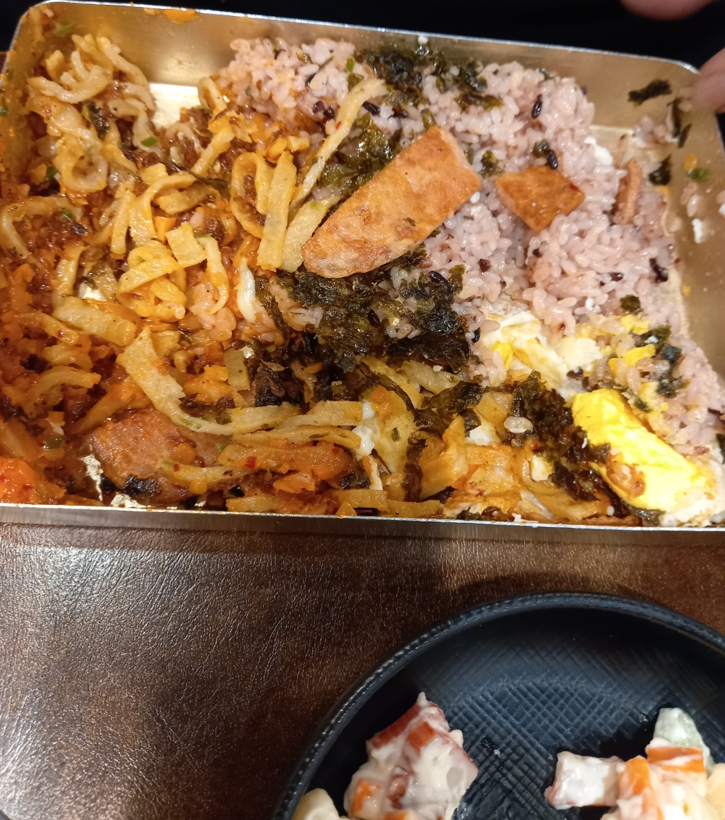 여러가지 반찬과 스팸이 들어있는데 배고플땐 역시 밥을 먹어야죠.