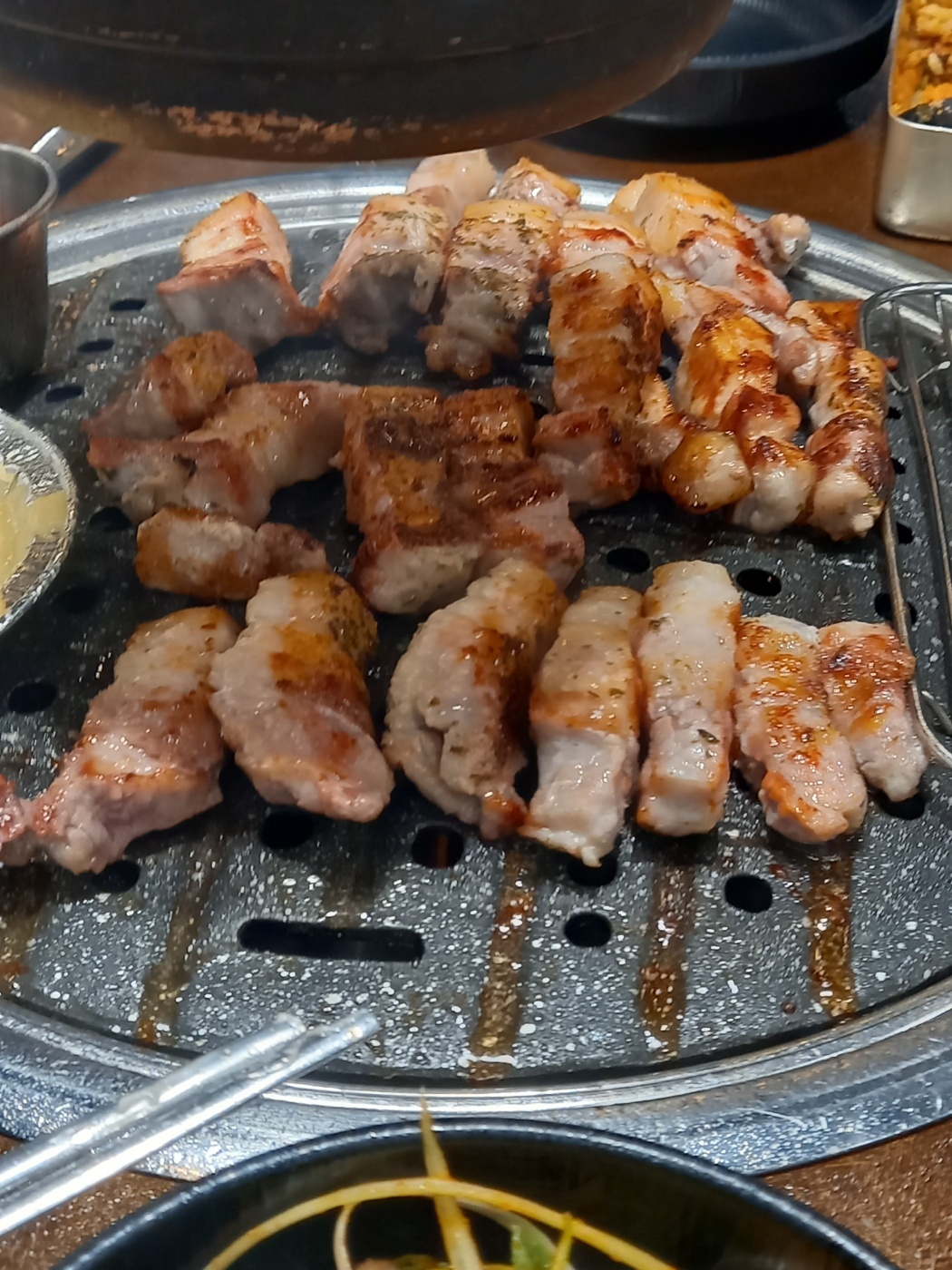 제 친구가 고기를 정말 잘 굽는데 매우 맛있게 생삼겹살이 구워졌습니다.