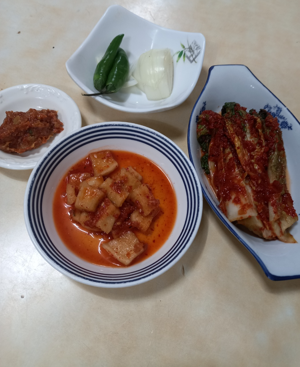 양파 고추 깍두기 배추김치.