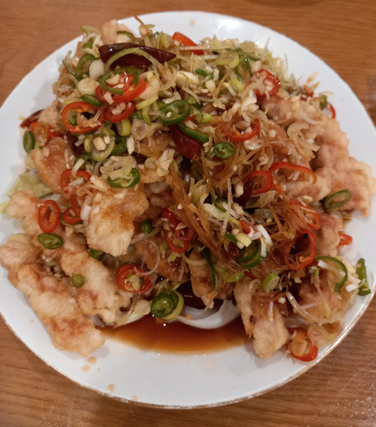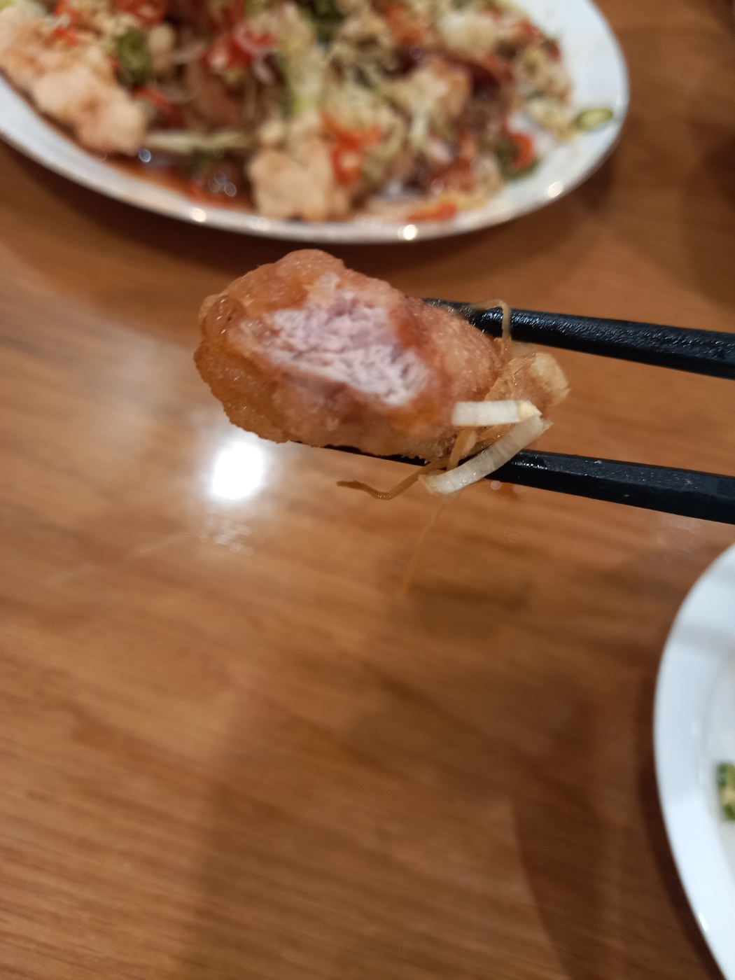 노릇노릇 잘튀겨진 돼지고기에 함께나오는 야채와 고추를 같이 먹으면 더욱 맛있습니다.