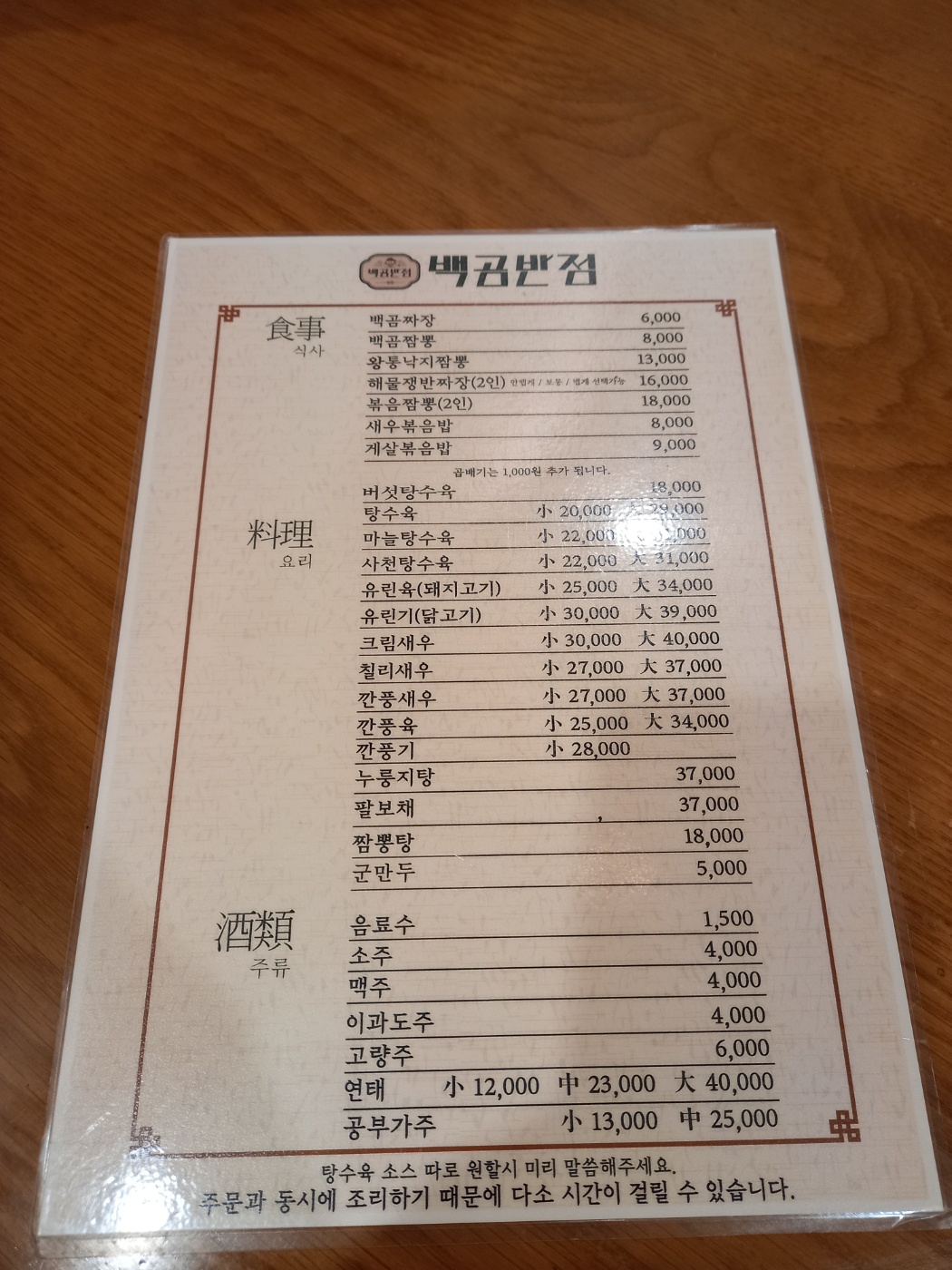 중화요리 전문점답게 식사류 요리류 주류를 판매하고있고요.