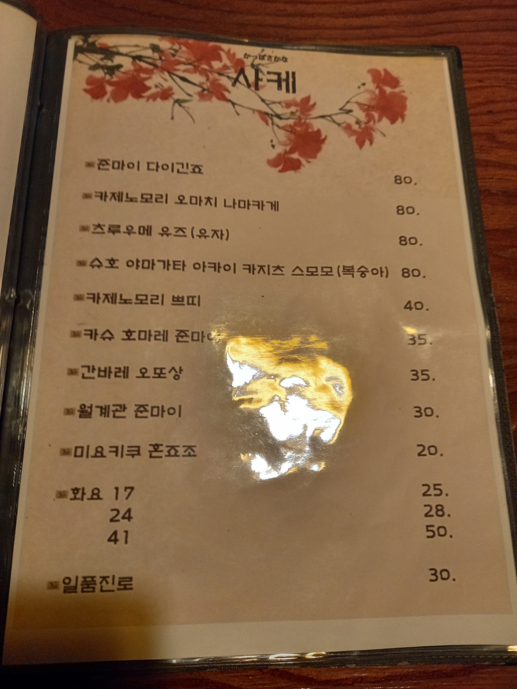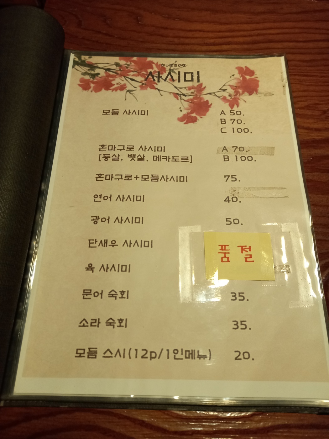 보통 이자카야의 메뉴들로 구성되어 있는데 주로 제일 잘 판매되는게 사시미 종류라 하시더라고요.