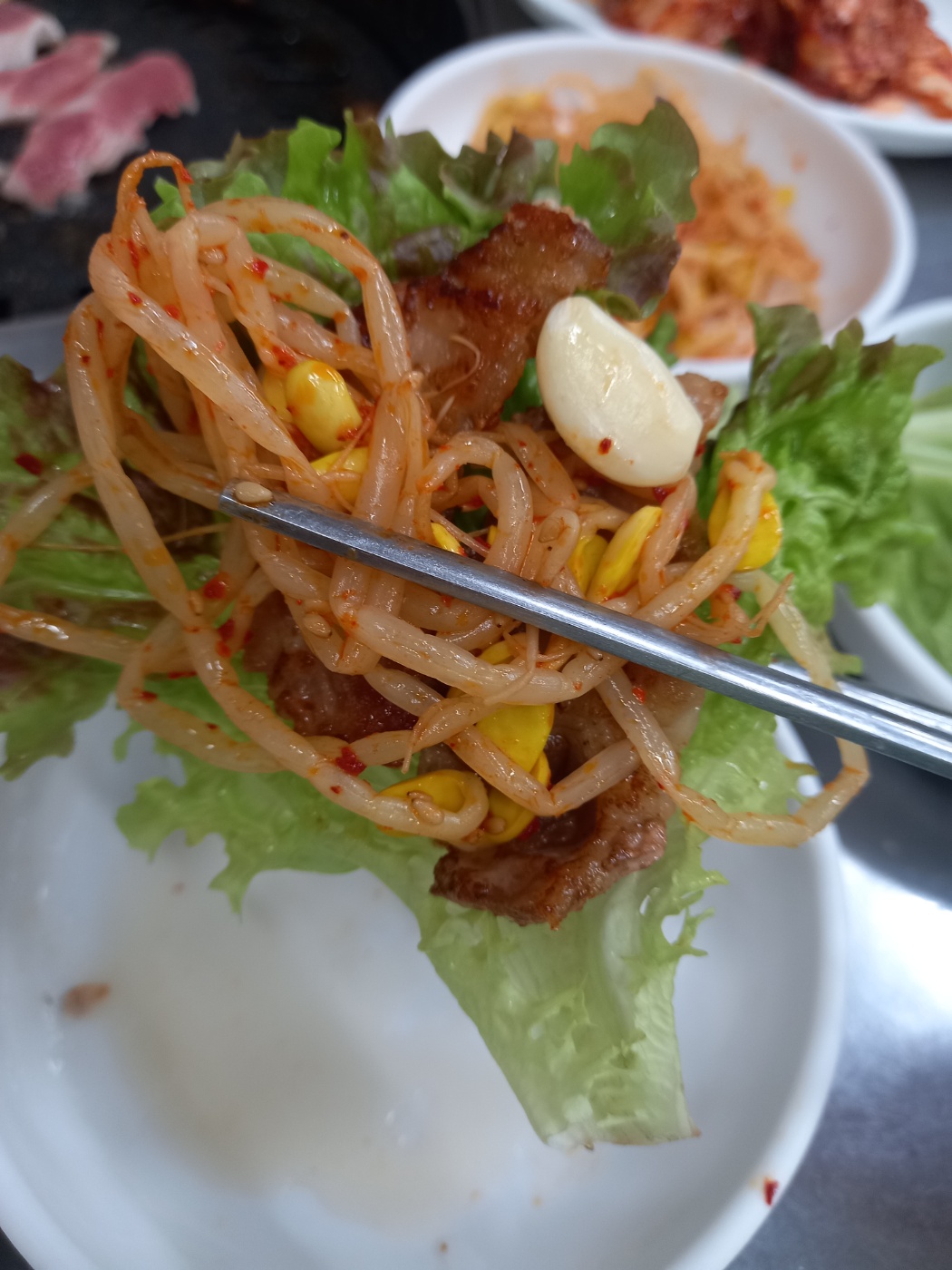 다 구운 삼겹살을 콩나물과 파절이와 함께 먹었습니다.