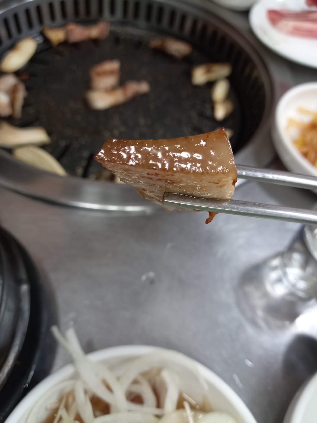 그리고 핵심은 고기의 식감이 쫀득함이 있었는데 껍데기가 살짝 붙어있더라고요.