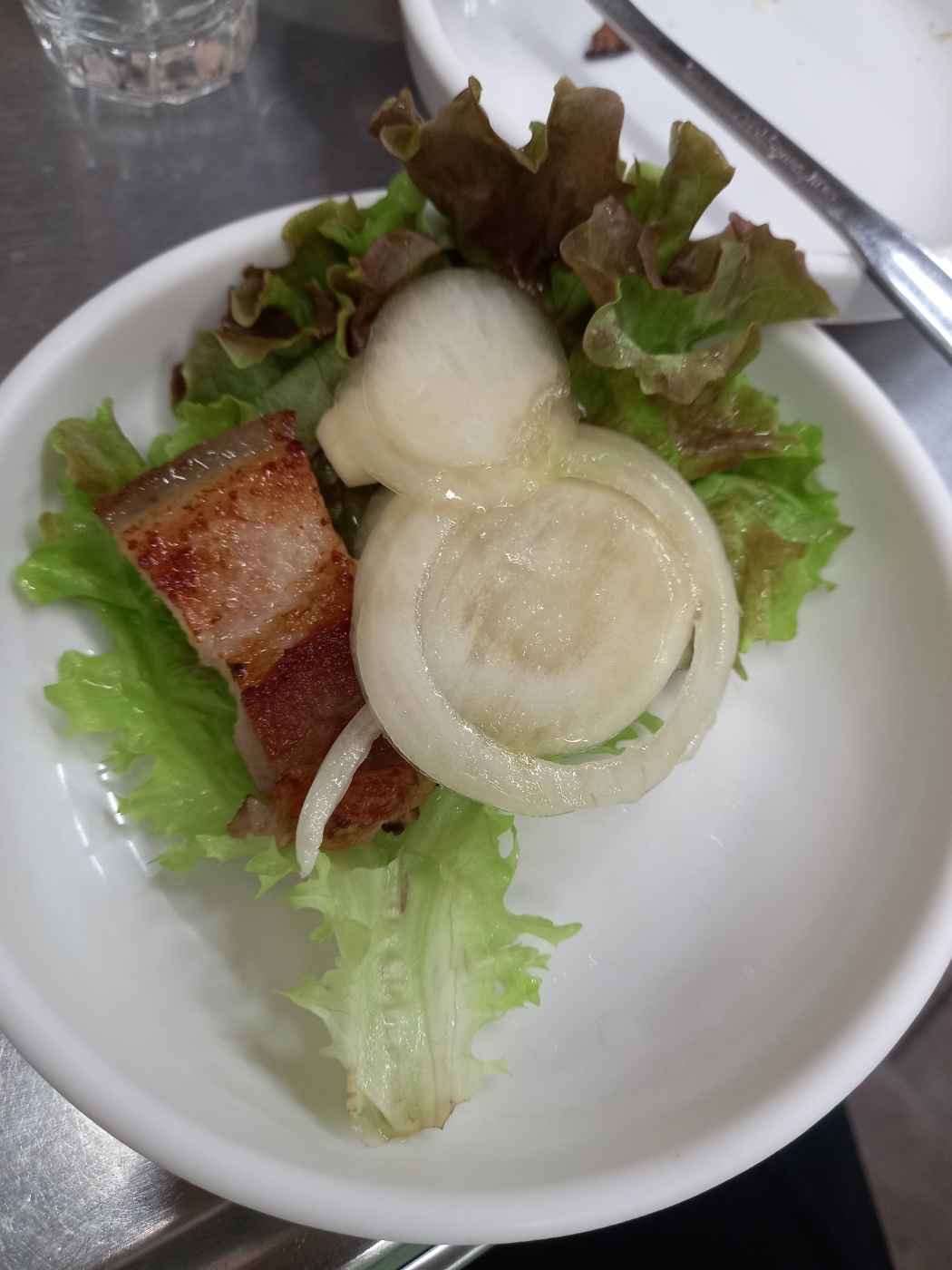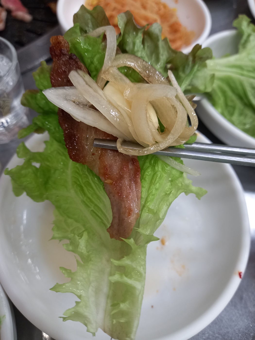뒷고기도 상추에 양파를 올려서 먹었습니다.