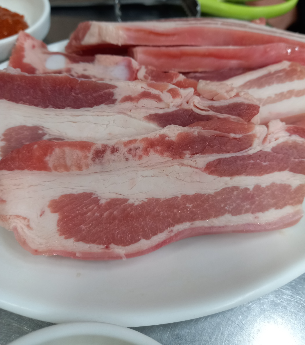 적당한 비계의 비율과 두툼한 생삼겹살이 정말 상태가 좋아보입니다.