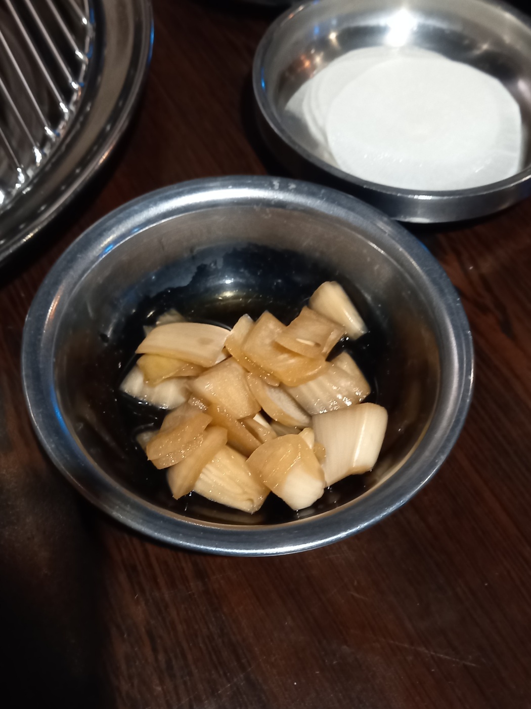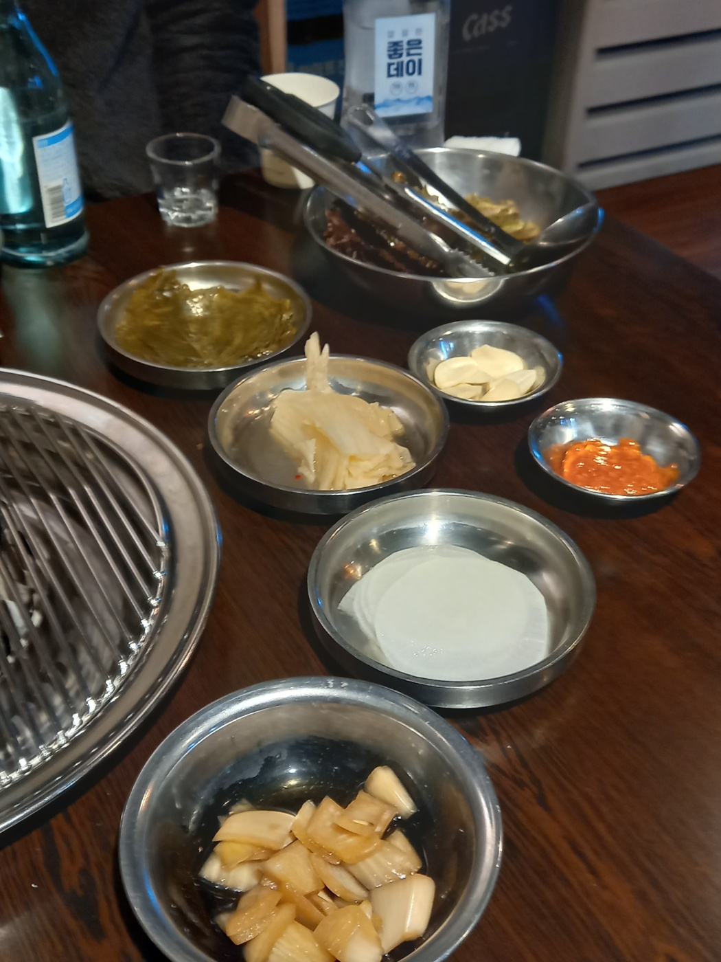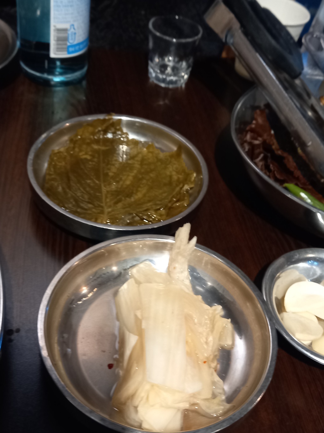양파절임, 무 슬라이스, 씻은 배추김치, 간장절임 깻잎, 마늘, 열무 김치가 나왔습니다.