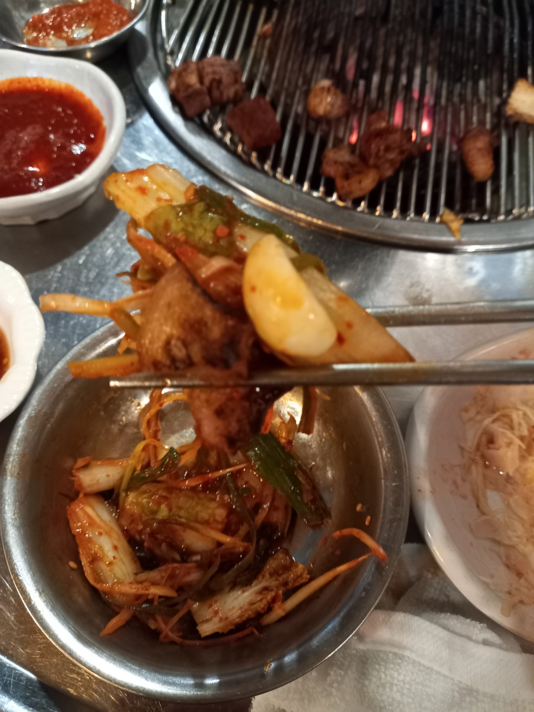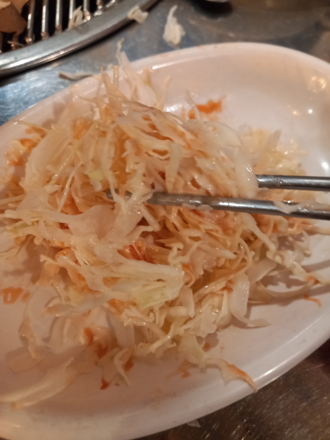 고기를 썰어서 가져오실동안에 김치볶음밥과 양배추샐러드를 먹고 있었습니다.