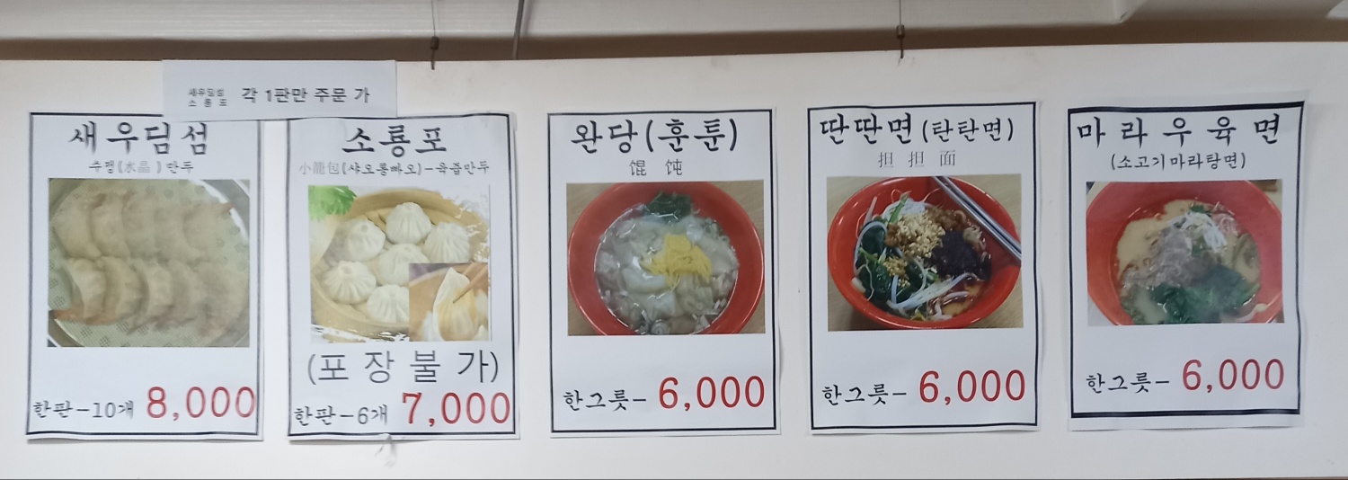 메뉴는 다양하게 판매하지않고 새우딤섬 소룡포만두 완당 탄탄면 마라우육면을 판매하고 있습니다.