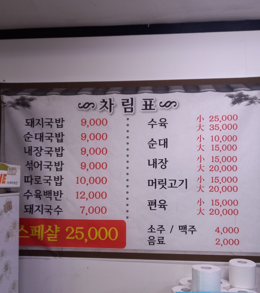 일단 다양한 식사메뉴로 국밥 메뉴와 수육백반, 그리고 안주류로 수육 순대등 판매하고 있습니다.