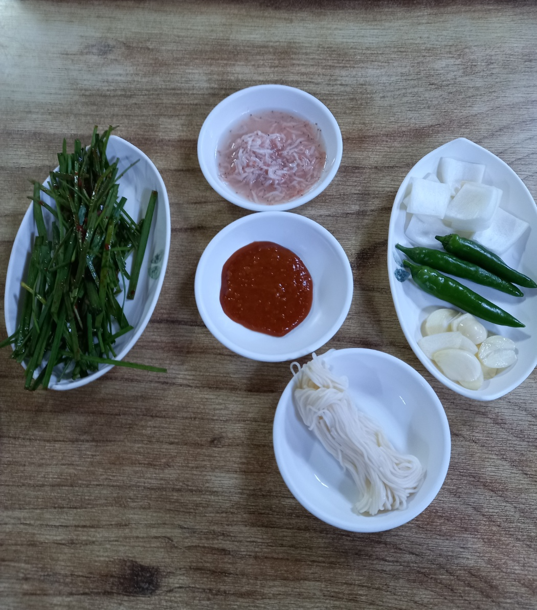 그리고 부추와 새우젓 마늘 양파 고추 쌈장 국수를 가져다 주셨습니다.