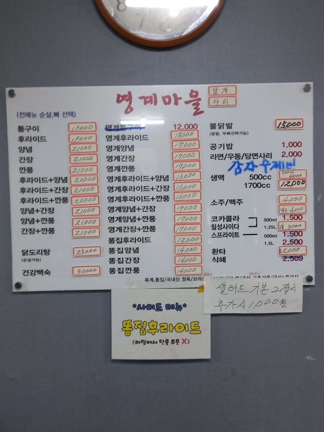 토성동 영계마을 메뉴판입니다.