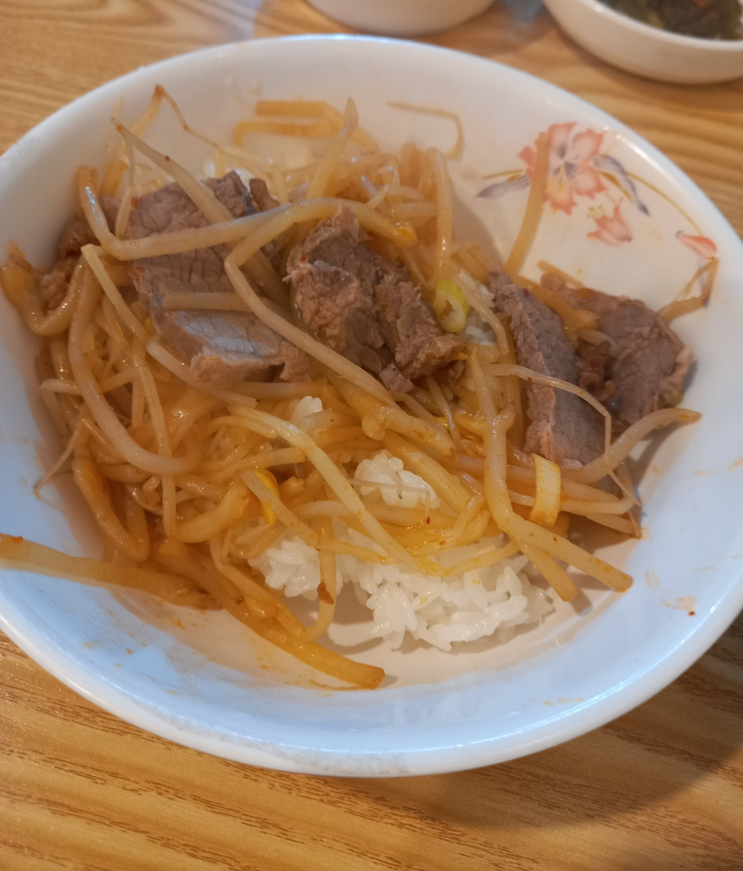 저는 국물에 말아먹기 싫어서 콩나물과 소고기를 밥에 넣고 비볐습니다.
