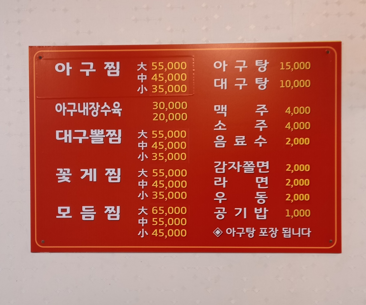 아구찜과 대구뽈찜 그리고 모듬찜 꽃게찜도 판매하네요.