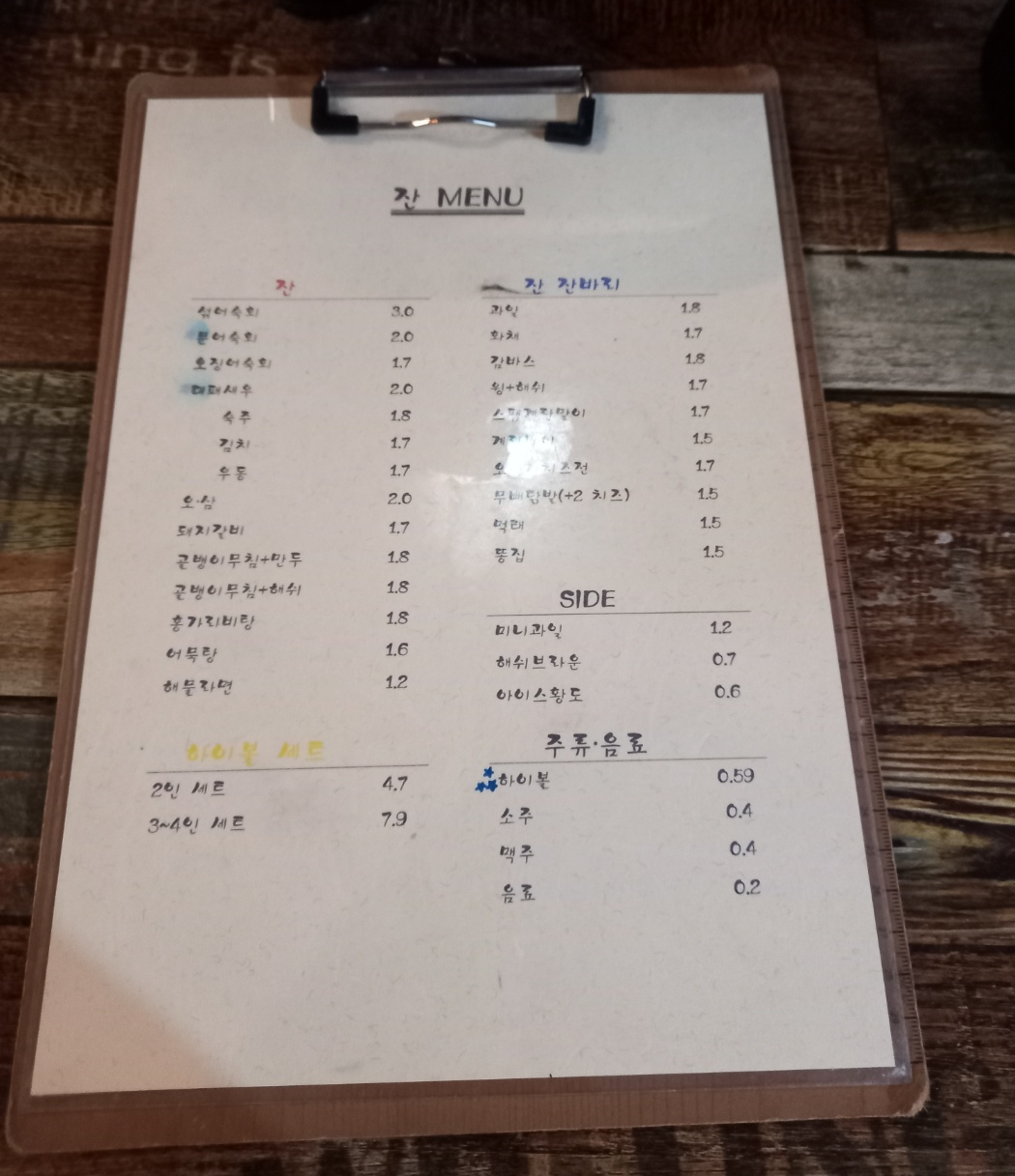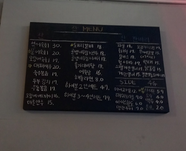 남항동 술집 잔 메뉴판입니다.
