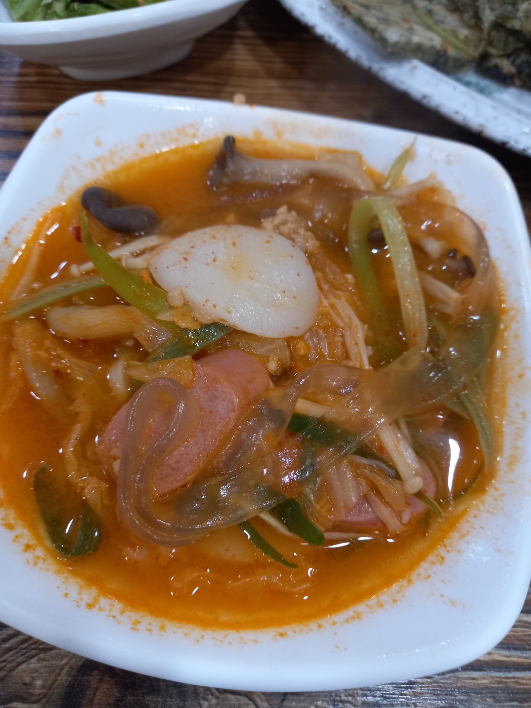 버섯 야채 소세지 두부 감자당면등 여러가지가 들어있습니다.