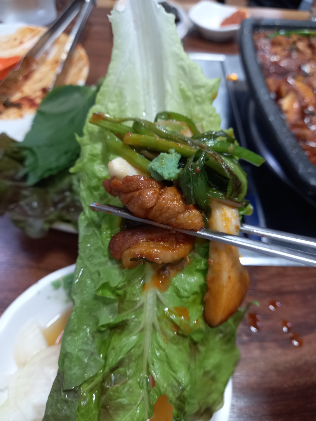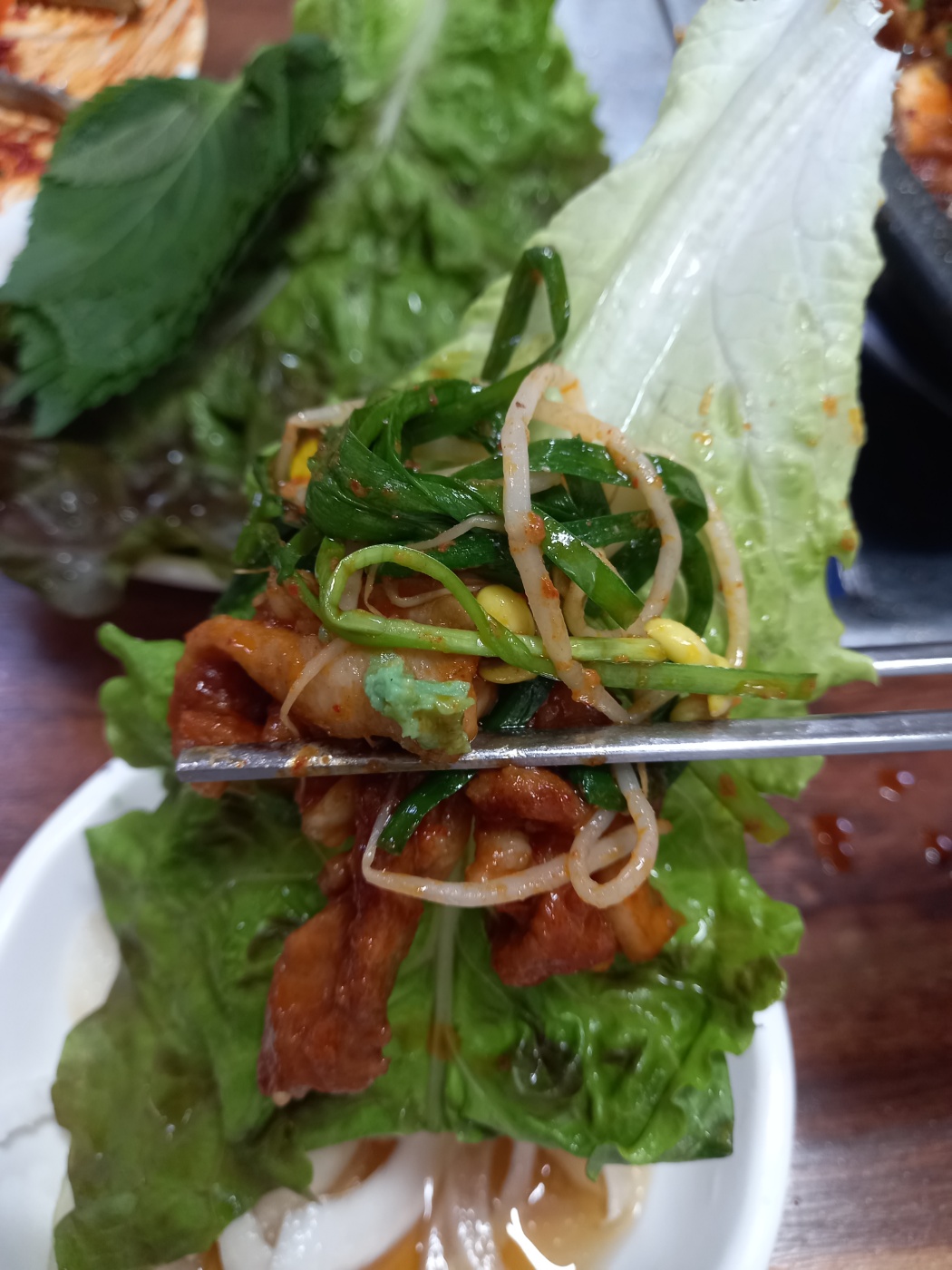 맛있는 오리양념구이를 상추에 부추 콩나물 마늘 양파등을 올려서 먹습니다.