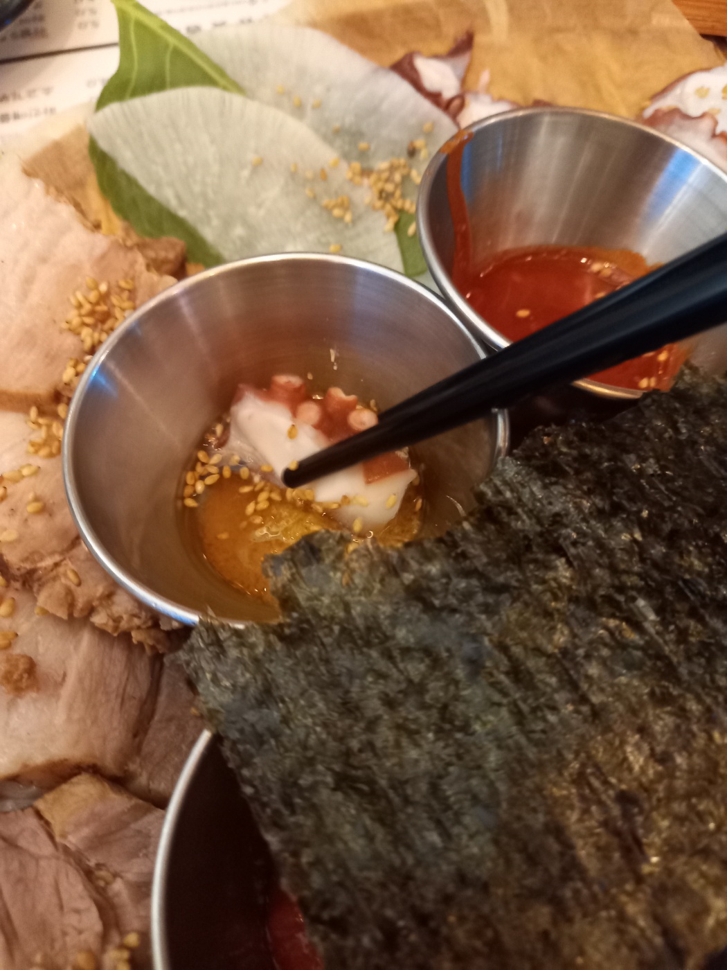 보쌈과 무말랭이를 함께 먹고 탱탱한 문어숙회를 기름장에 찍어서 먹습니다.