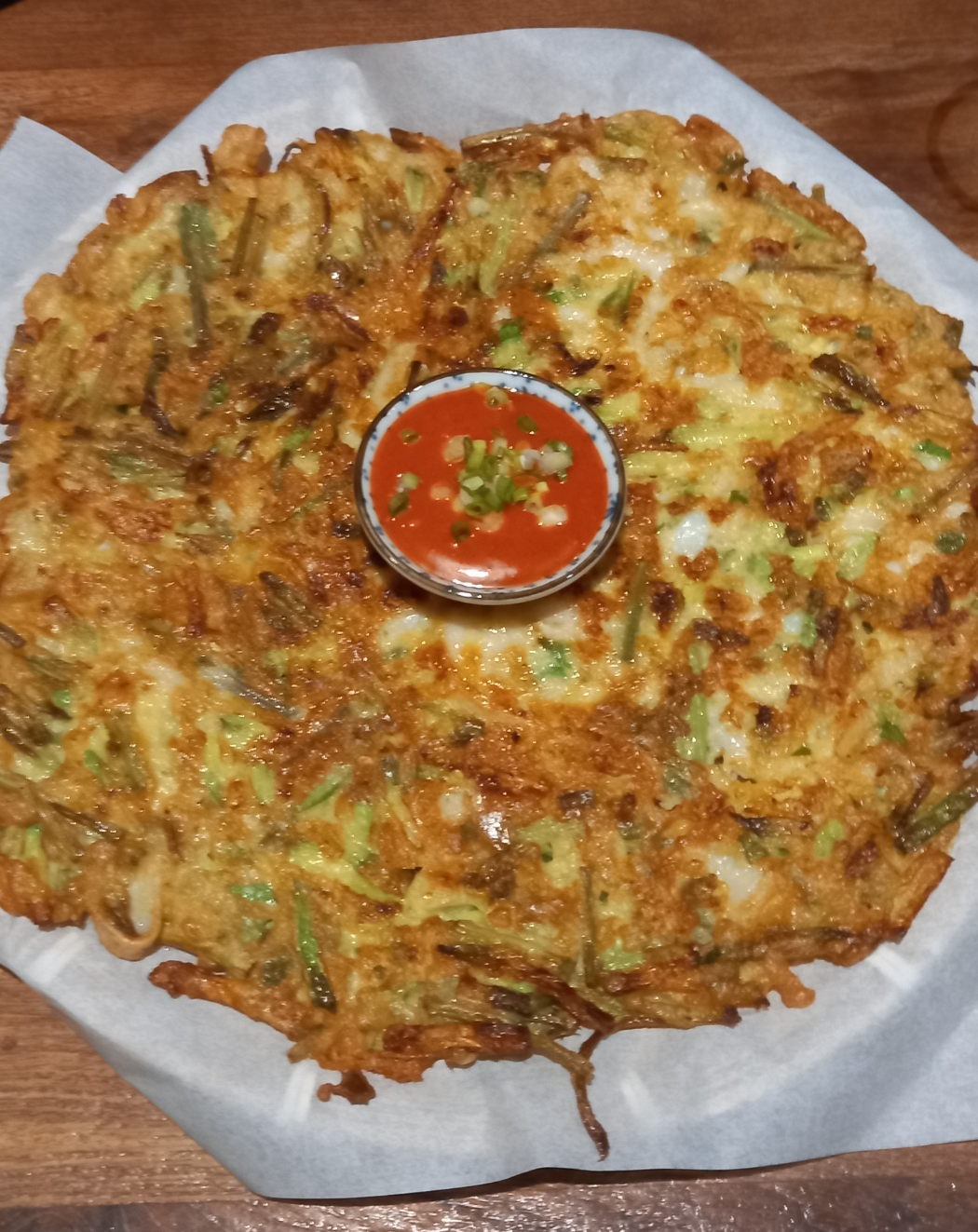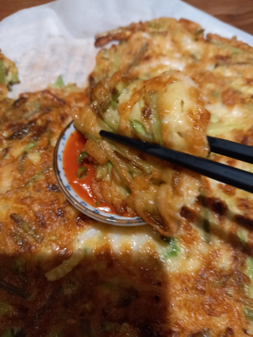 맛있게 잘 부쳐진 오징어애호박채전을 한점 먹어봅니다.
