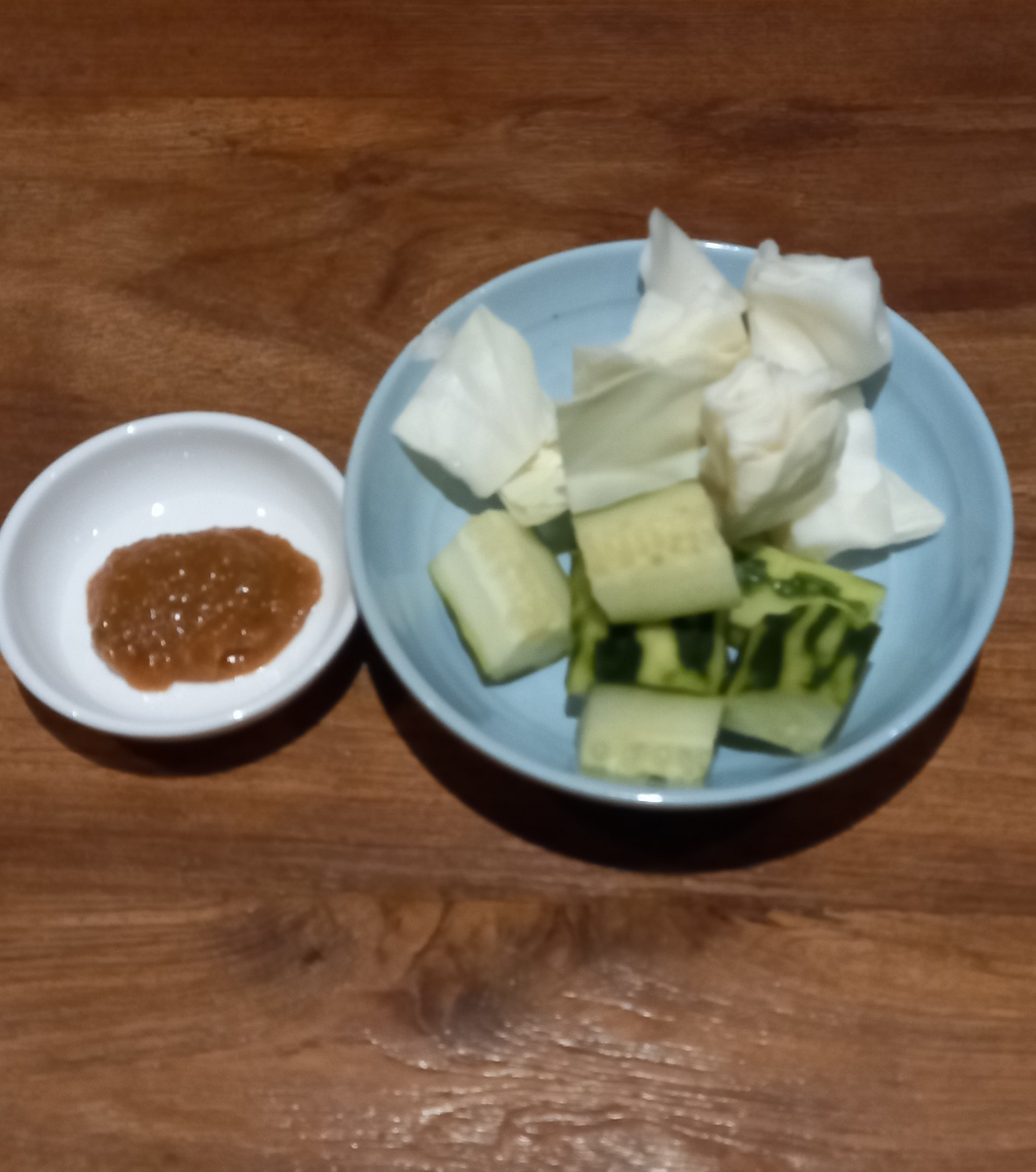 주문을하고 밑반찬으로 오이와 양배추가 나옵니다.