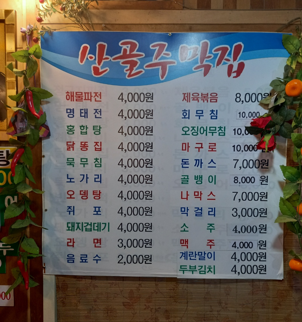 산골주막집 메뉴판인데 가격들이 정말 저렴합니다.