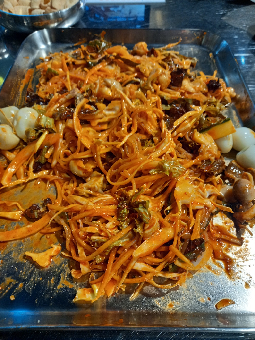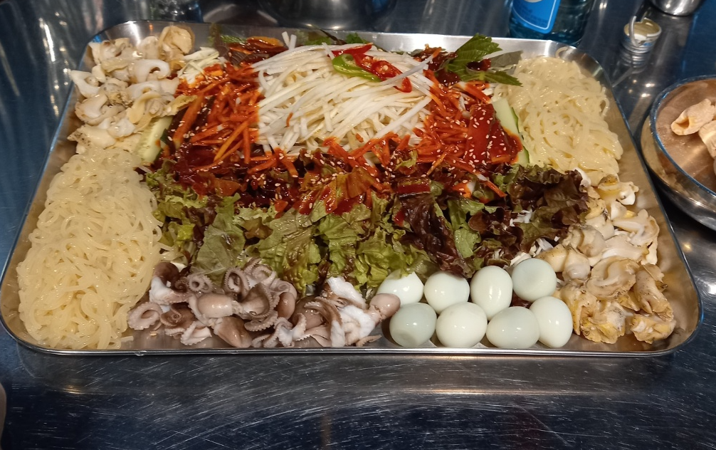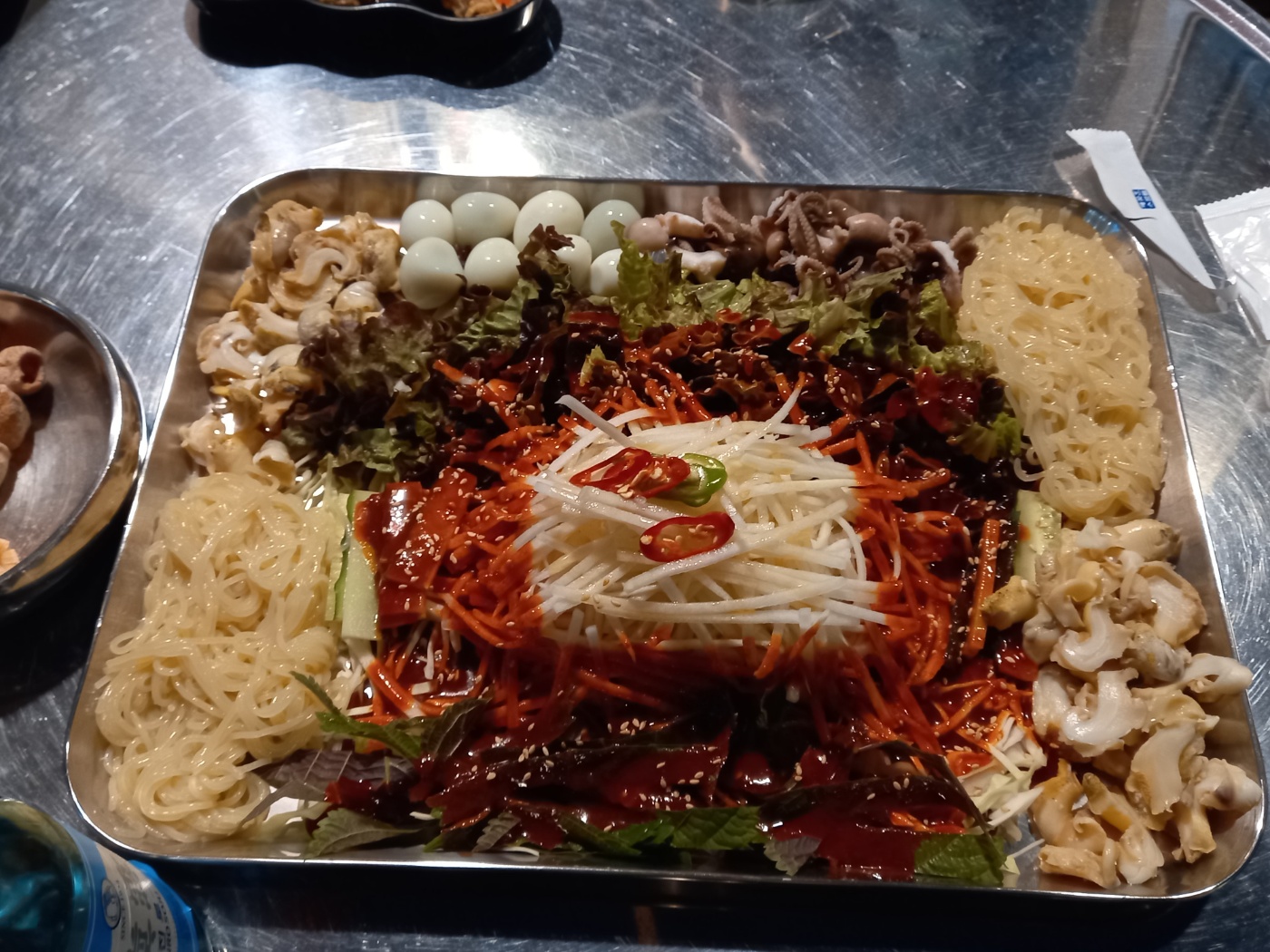 아삭아삭한 채소들과, 쫀득쫀득한 쭈꾸미와 골뱅이, 거기에 담백한 메추리알과 면까지