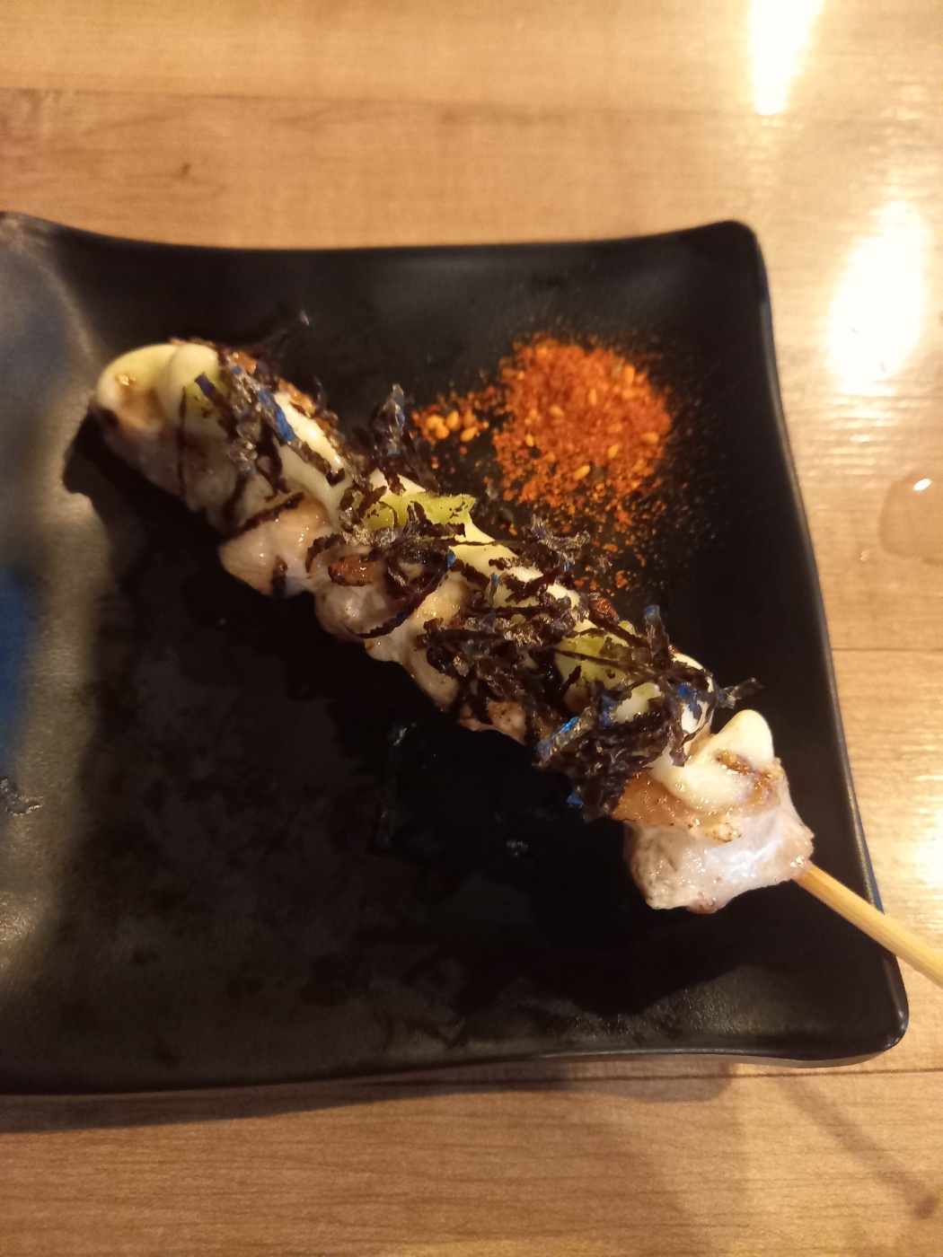 부드러운 닭다리살에 와사비와 마요 소스가 올려져서 나오는데