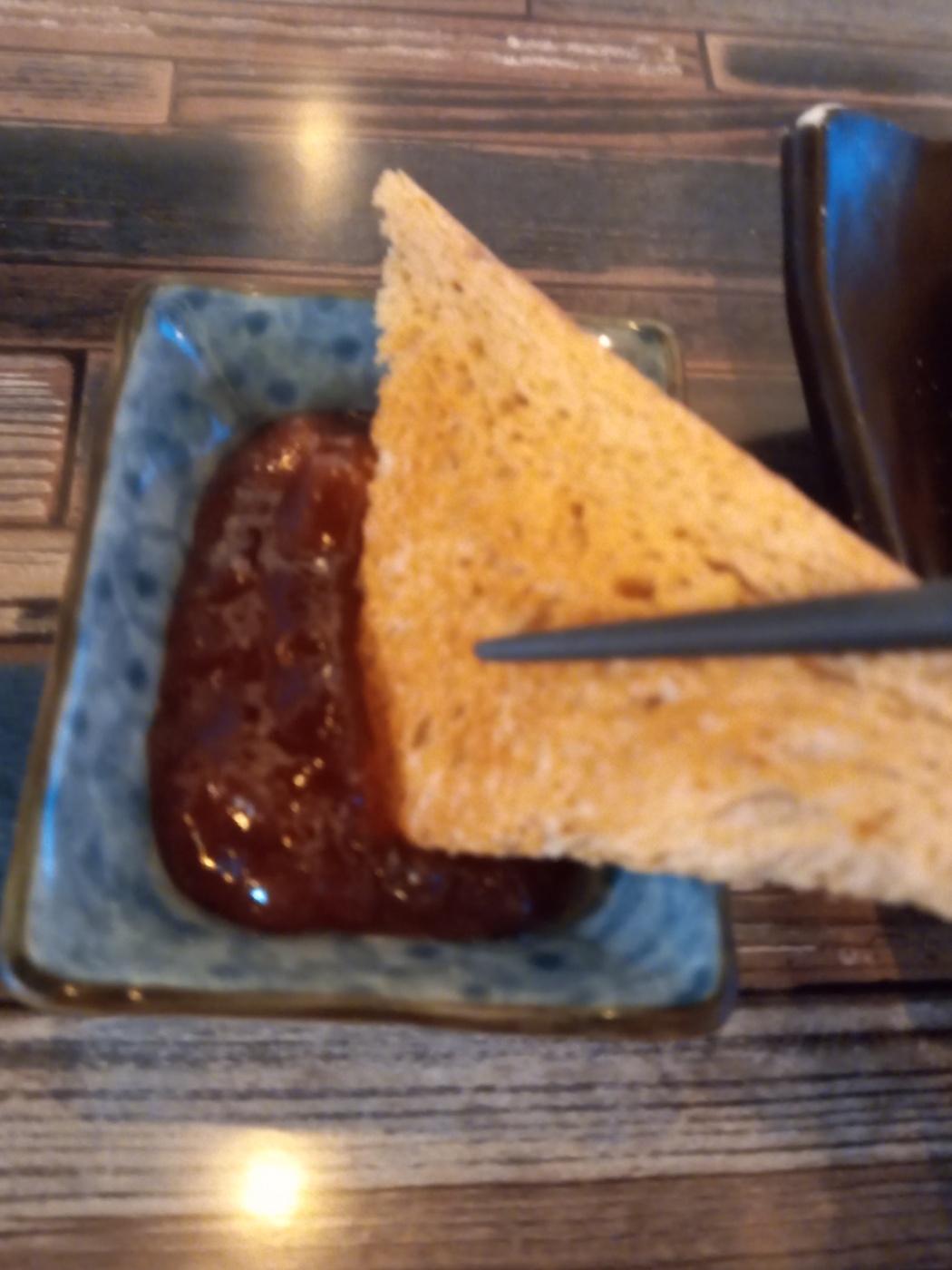 바삭하고 부드러운 식빵을 달콤한 딸기잼에 찍어먹으니 맛있습니다.