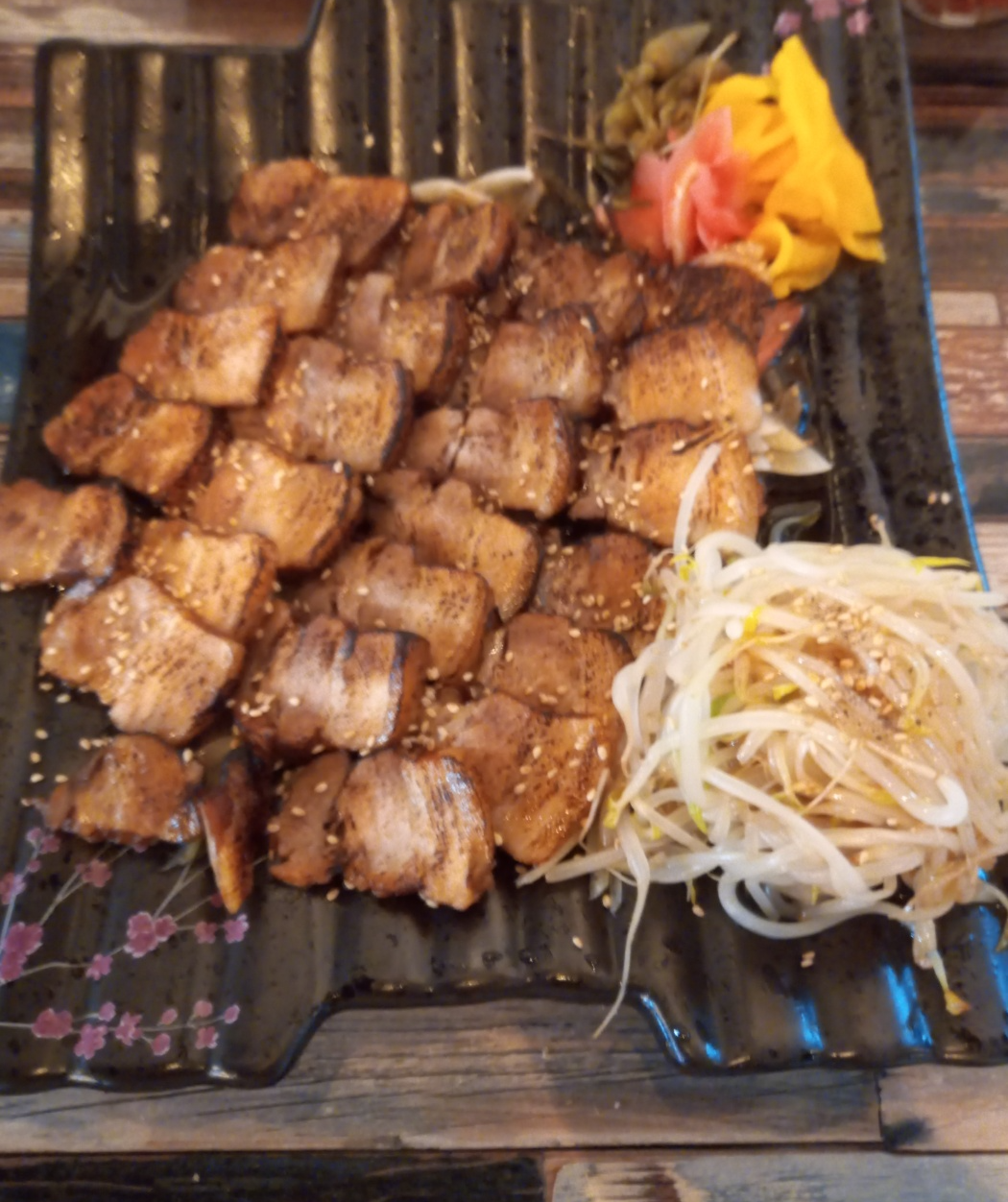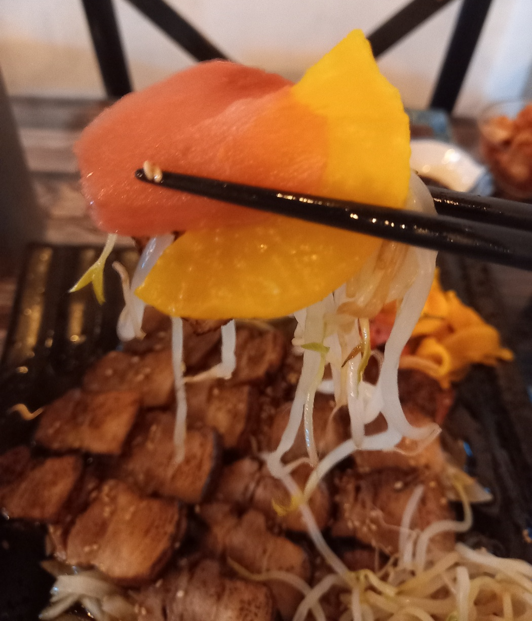 맛있는 차슈를 초생강과 먹고 단무지와 먹고 양파와 먹습니다.