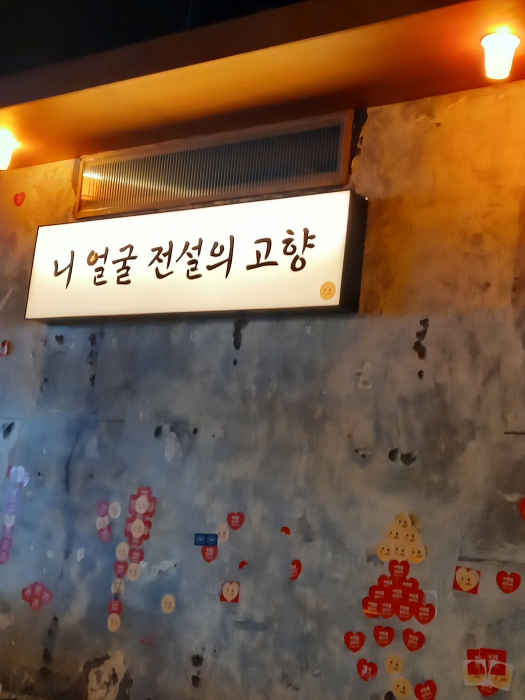 벽면 곳곳에 맛돌이포차 스티커들이 붙여져 있습니다.