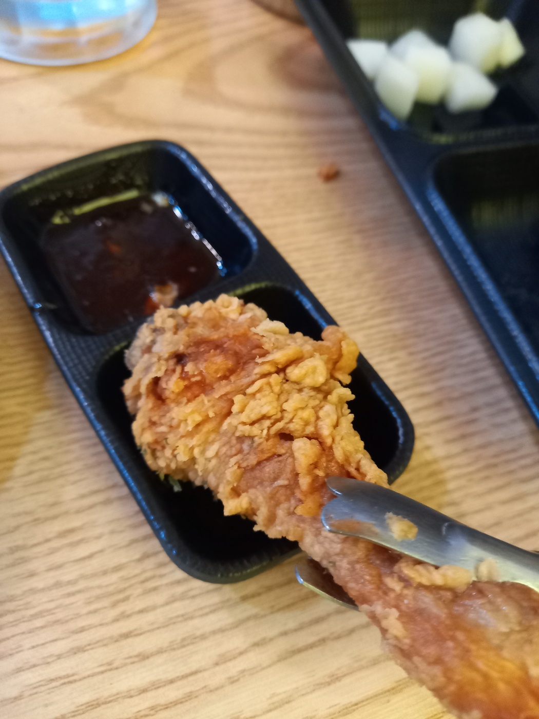먼저 바삭바삭하게 튀겨진 똥집후라이드를 땡초소스에 찍어먹어봅니다.