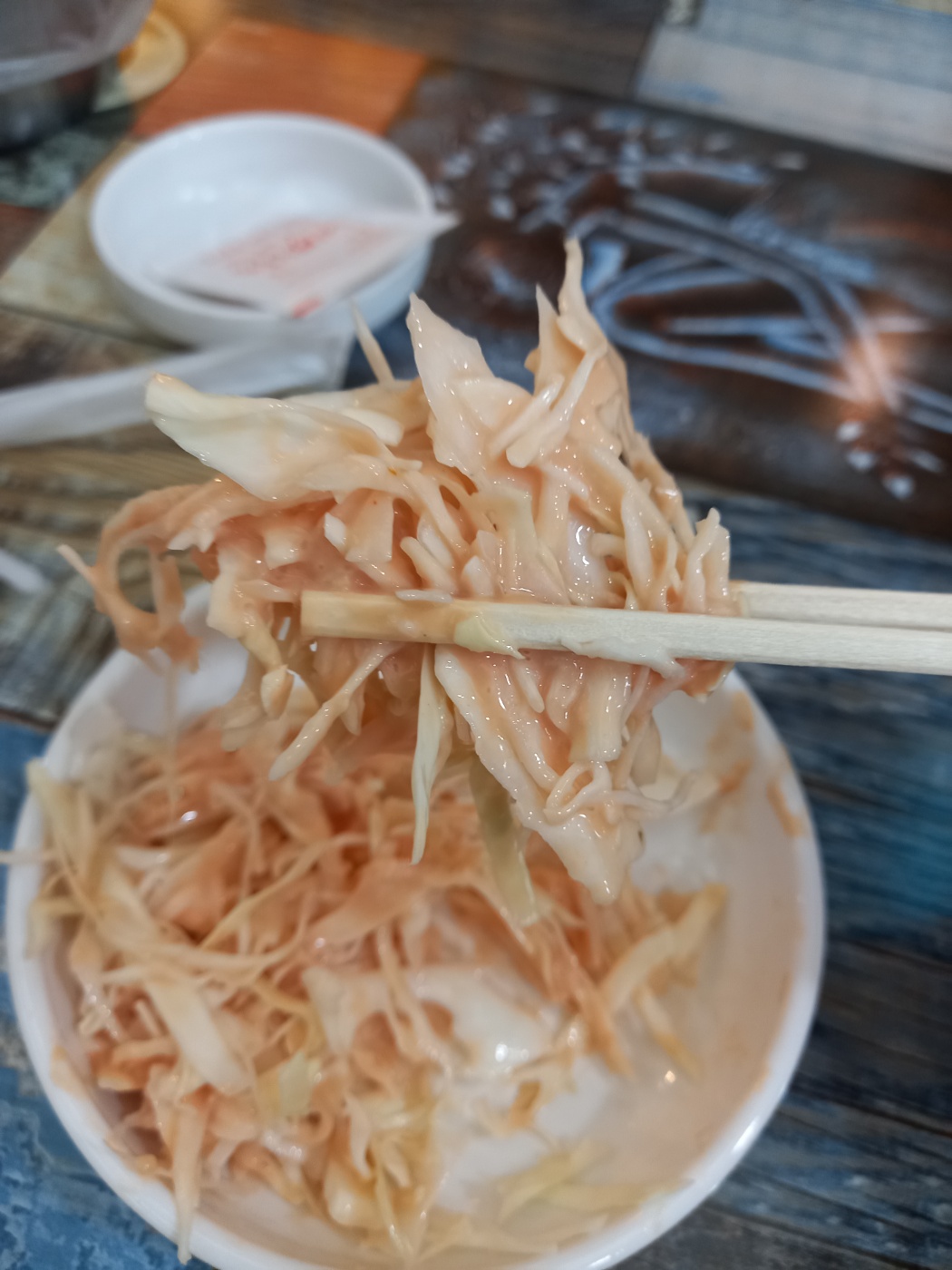 주문을하고 밑반찬으로 양배추샐러드와 무우가 나옵니다.