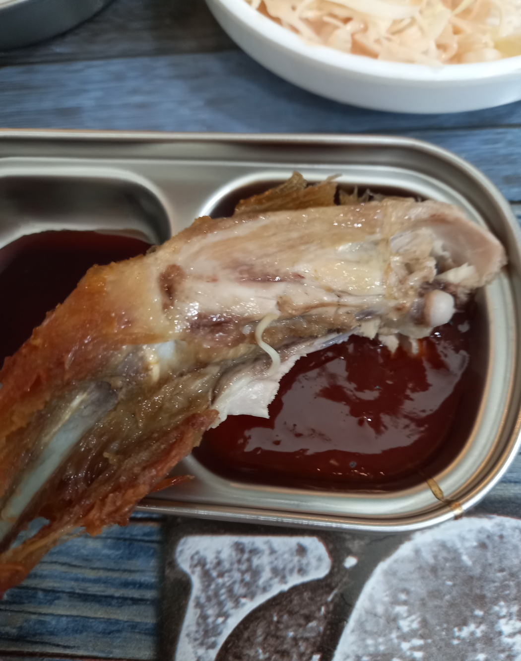 먼저 닭다리부터 먹었는데 튀김옷이 얇아서 부담없이 먹을 수 있는 통닭입니다.