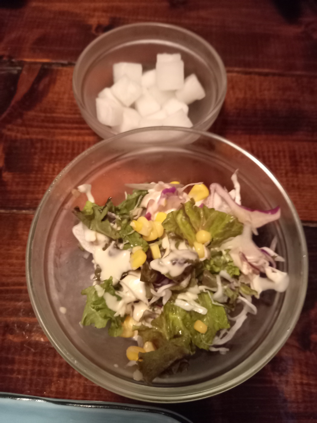치킨을 주문하고 양념소스와 무우 샐러드가 나옵니다.