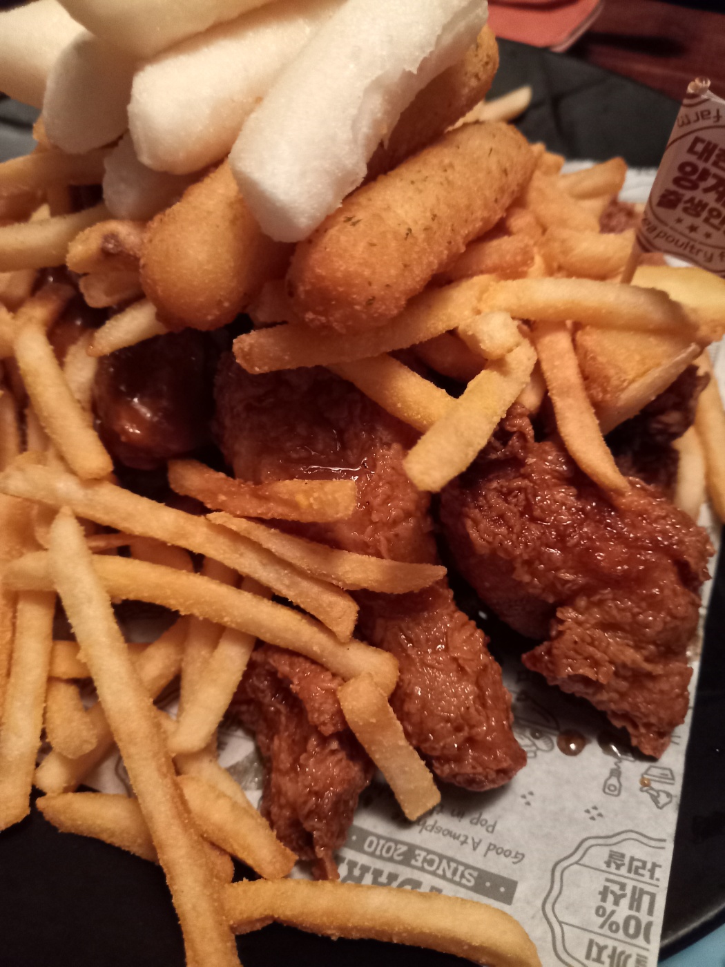 치킨집인데 치킨만 나오는게 아니고 감자튀김 떡튀김도 나옵니다.