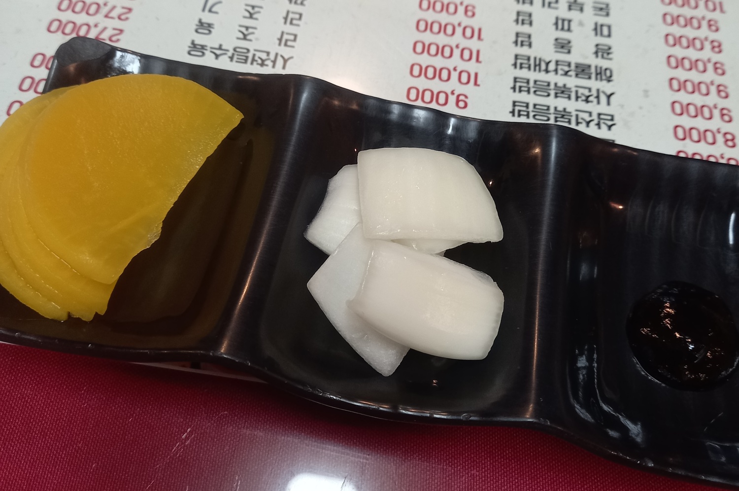 밑반찬으로는 단무지 양파 김치가 나옵니다.